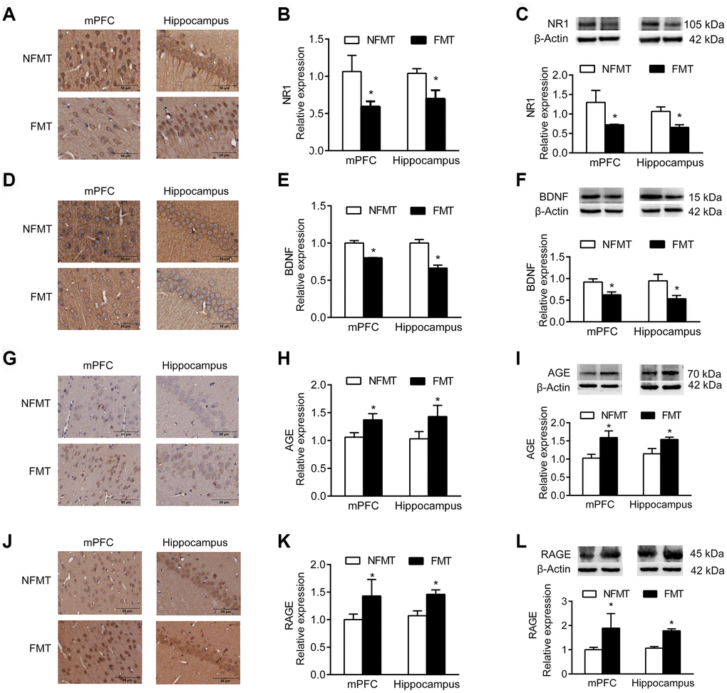FMT of aged microbiota changes expression of NR1, BDNF, and AGE/RAGE
