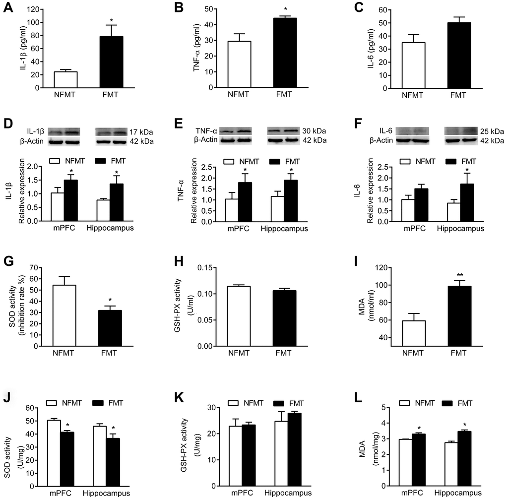 Since our results showed that the SOD activity in serum and brain declined, the MDA content increased, and the activity of GSH-PX did not change in aged rats (Figure 3G–3L), we tested whether the FMT of aged microbiota will cause similar changes in young rats. In serum, the SOD activity of FMT rats declined, and the MDA content increased compared with NFMT rats (P < 0.05, Figure 8G, 8I). The SOD activity also declined and the MDA content increased in mPFC and hippocampus of FMT rats compared with NFMT rats (P < 0.05, Figure 8J, 8L). The activity of GSH-PX did not change in serum and brain (Figure 8H, 8K). These results suggest that oxidative stress might represent another mechanism contributing to the cognitive decline in normal aging.