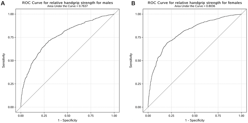The ROC curve was used to evaluate the performance of the adjusted model to analyse the association between relative handgrip strength and prevalence of MetS. The AUC with 95% CI for each adjusted model in both male and female participants is shown in Figure 1. The AUC value of the adjusted model for male participants was 0.76 (95% CI: 0.74, 0.78) and that for female participants was 0.80 (95% CI: 0.79, 0.82). The cut-off values of relative handgrip strength were 0.52 and 0.40 for male and female participants, respectively.
