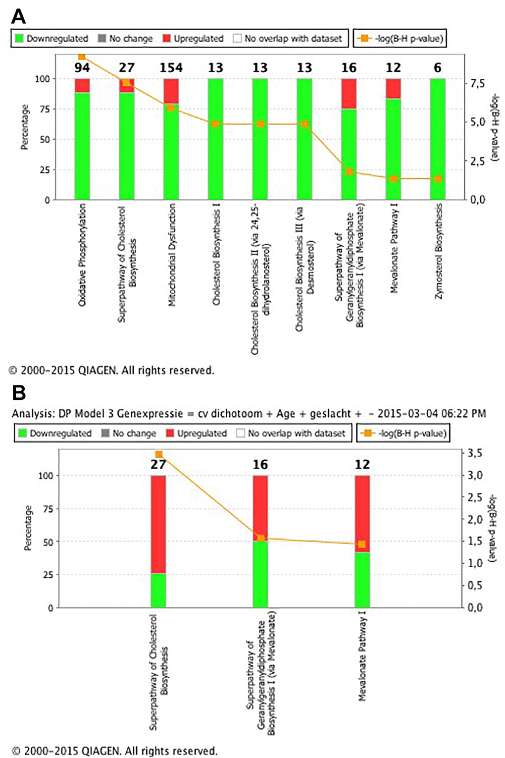 RT-PCR was performed in the validation cohort using OpenArray™ technology, a real-time PCR–based solution for high-throughput gene expression analysis (Quantstudio 12K Flex Real-Time PCR system, Thermofischer Scientific; Ghent, Belgium). After analysis of the intersecting pathways enriched in the micro-array gene expression analyses, expression of individual genes from the most robust pathway was validated. 14 genes were selected from the micro-array model (FDPS; DHCR7; LSS; HMGCR; FDFT1; IDI1; ACAT2; NSDHL; HMGCS1; CYP51A1; SQLE; MSMO1; MVD; HSD17B7) together with 3 housekeeping genes 18s, HPRT and GAPDH (Supplementary Table 5).
