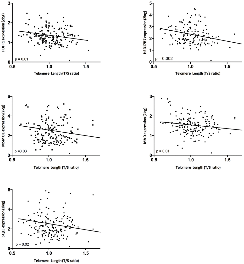 Given the significant enrichment of the superpathway of cholesterol biosynthesis in both the analysis of telomere length and intrarenal arteriosclerosis, in these unrelated analyses (Supplementary Table 1), we validated selected genes of this pathway (Table 1; Figure 2 and Supplementary Tables 2, 4) in the independent validation cohort (N=159). In 14 biopsies (8%) there was no evaluation of arteriosclerosis because there was no vessel present in the biopsy. Telomere length correlated significantly with the expression of FDFT1 (p= 0.01, r=-0.20), MSMO1 (p= 0.03, r=-0.16), MVD (p= 0.01, r=-0.16), HSD17B7 (p= 0.002, r=-0.24) and SQLE (p= 0.02, r=-0.17) (Figure 3). When the genes involved in this pathway were expressed as the first principal component of the whole pathway, also this parameter correlated highly significantly with intrarenal telomere length (p= 0.002).