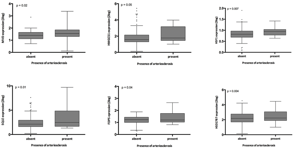 Presence of arteriosclerosis associated significantly with expression of SQLE, FDPS, MVD, HMGCS1, HSD17B7 and HSF1 (all p≤0.05) (Supplementary Table 4, Figure 4). When the genes involved in this pathway were expressed as the first principal component of the whole pathway, also this parameter associated highly significantly with intrarenal arteriosclerosis (p= 0.006).