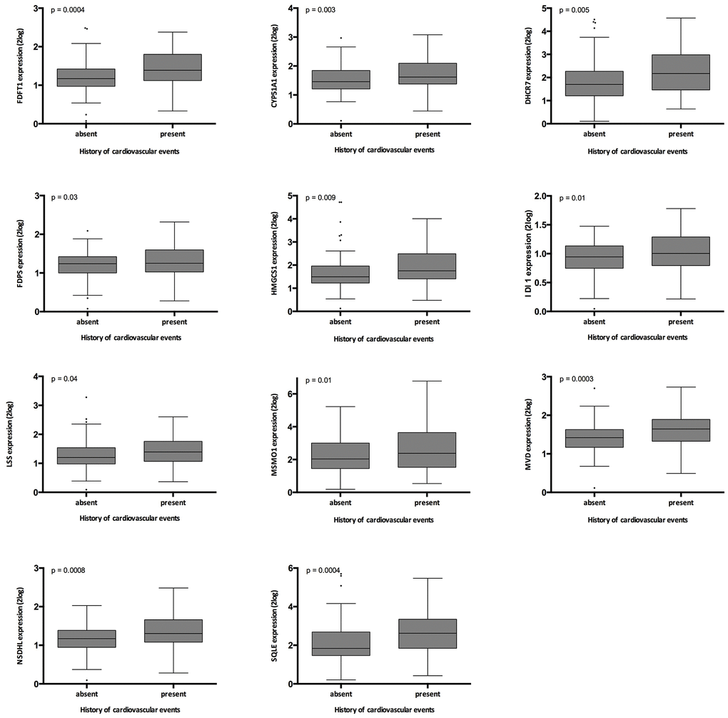 History of cardiovascular events associated significantly with the expression of FDFT; DHCR7; FDPS; HMGCS1; IDI1; LSS; MSMO1; MVD; NSDHL; SQLE; CYP51A1 (Supplementary Table 4, and Figure 5). When the superpathway of cholesterol biosynthesis was expressed as the first principal component of all genes involved in this pathway, this parameter associated highly significantly with history of cardiovascular events (p= 0.004).