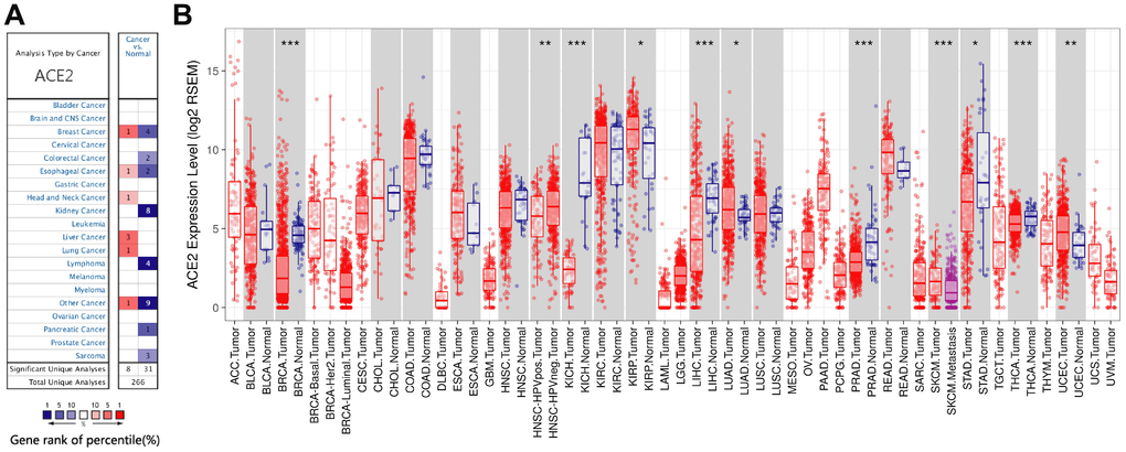 ACE2 expression in different tumors was identified in the Oncomine database (https://www.oncomine.org/resource/main.html) [27]. The threshold was a P-value of 0.01, a 1.5-fold change, and a top 10% of gene ranking. The data must come from mRNA.
