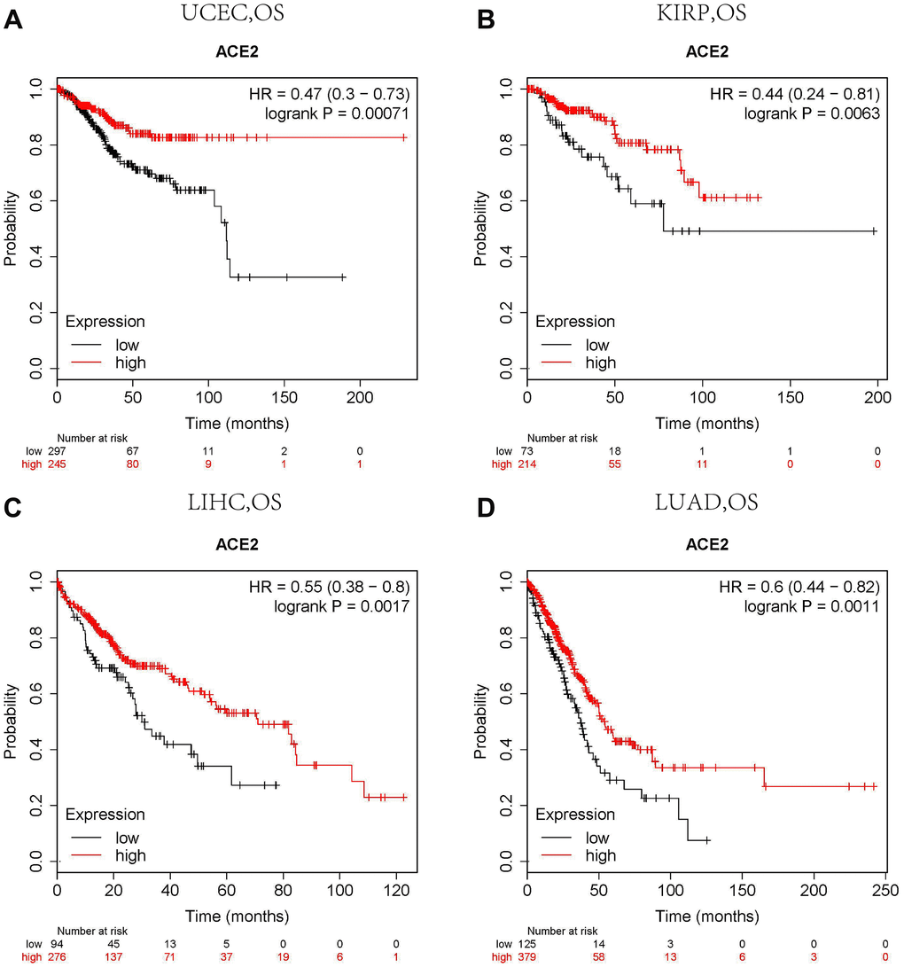 The Kaplan Meier plotter is a large database containing GEO, EGA and TCGA. It can be used as a tool to evaluate genes on survival in 21 cancer types. Therefore, we used the Kaplan Meier plotter to further check the relationships between ACE2 and prognoses of different tumors. ACE2 expressions have no significant correlations with the prognoses of breast cancer, head neck squamous cell carcinoma, stomach adenocarcinoma and thyroid carcinoma (Supplementary Figure 1H–1K). However, high ACE2 expression levels in uterine corpus endometrial carcinoma and kidney renal papillary cell carcinoma showed significant favorable prognoses (OS HR0.47, 95%CI=0.30 to 0.73, OS HR0.44, 95%CI=0.24 to 0.81, respectively) (Figure 2A, 2B). Similar prognoses were also observed in liver hepatocellular carcinoma and lung adenocarcinoma (Figure 2C, 2D).