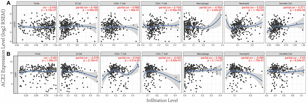 We have confirmed that the expressions of ACE2 were correlated with the immune infiltration in uterine corpus endometrial carcinoma and kidney renal papillary cell carcinoma, and the expressions of ACE2 were also related to the favorable prognoses of these tumors. So we speculated that the expressions of ACE2 in these tumors affected the prognosis partly because of immune infiltration.