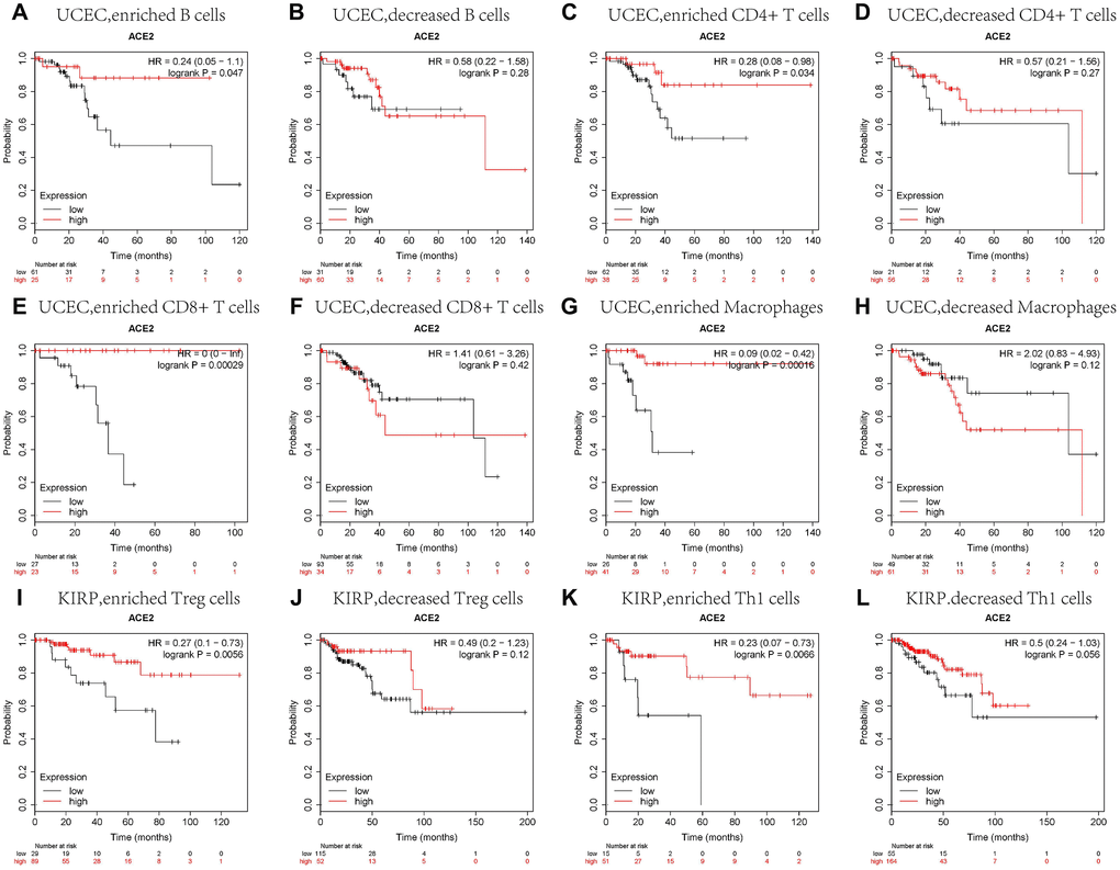 We did a prognosis analysis based on the expression levels of ACE2 of different tumors in related immune cells subgroup via the Kaplan Meier plotter. The results showed that the high expression of ACE2 of uterine corpus endometrial carcinoma in enriched B cells (HR = 0.24), enriched CD4+ memory T cells (HR = 0.28), enriched CD8+ T cells (HR = 0) and enriched macrophages (HR = 0.09) cohort had better prognosis respectively (Figure 4A, 4C, 4E, 4G). Similarly, the high expression of ACE2 of Kidney Renal Papillary Cell Carcinoma had better prognosis in enriched regulatory T cells (HR = 0.27) and enriched type 1 T helper cells (HR = 0.23) cohort respectively (Figure 4I, 4K). But there was no significant correlation between the high ACE2 and the prognosis of Kidney Renal Papillary Cell Carcinoma in the enriched macrophages cohort (OS HR0.63, 95%CI=0.3 to 1.3, logrank P=0.21), and the high expressions of ACE2 of UCEC and KIRP had no significant correlation in decreased immune cells subgroup (Figure 4B, 4D, 4F, 4H, 4J, 4L). The above analysis suggested that high ACE2 expressions in UCEC and KIRP may affect prognoses in part due to immune infiltration.