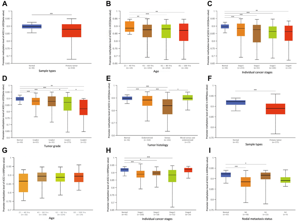 The significant increases of ACE2 expressions in UCEC and KIRP were observed. Therefore, we further studied the reason for the elevated ACE2. DNA methylation is an important event in the epigenetic modification of the genome and is closely related to the process of the disease [33]. In particular, hypomethylation can lead to genome instability [34, 35], and may activate related genes. So we used UALCAN database to verify the methylation levels of ACE2 promoter in UCEC and KIRP. Interestingly, the methylation levels of ACE2 promoter in UCEC and KIRP were significantly lower than that in normal tissue (Figure 5A, 5F). Also, we stratified UCEC and KIRP according to patients' age, individual cancer stages, tumor grade, tumor histology and nodal metastasis status.