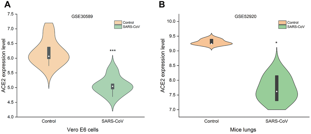 ACE2 can be used as a receptor for SARS-CoV-2 to enter the cell [24]. It is necessary to study the changes of ACE2 in tumors after SARS-CoV-2 infection. Because SARS-CoV-2 and SARS-CoV have high homology [24], the change of ACE2 expression after cells or animals infected with SARS-CoV can be used as a reference for SARS-CoV-2. GSE30589 and GSE52920 databases were used to analyze the changes of ACE2 expression after SARS-CoV infected Vero E6 cells and mice lung. The results showed that the expressions of ACE2 in Vero E6 cells and mouse lung decreased significantly compared with control group (Figure 6). This finding suggested that ACE2 expression may decrease after SARS-CoV-2 infection.