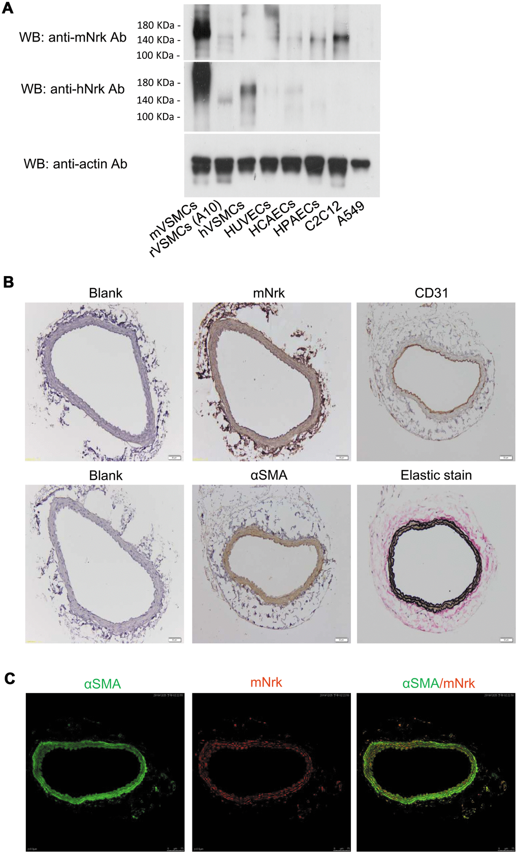 To further investigate whether Nrk is expressed in artery, mouse carotid artery and abdominal aorta were harvested and the expression of Nrk was examined by immunohistochemical (IHC) staining. Nrk was expressed in smooth muscle layers of carotid artery (Figure 1B) and abdominal aorta (Supplementary Figure 1). Staining of CD31 was performed as marker of endothelium, whereas αSMA and elastin stains were used as markers of smooth muscle layers (Figure 1B). Moreover, expression of Nrk in mVSMCs was further examined by immunofluorescence staining. Double staining of αSMA and mNrk was performed in mouse carotid artery (Figure 1C) and cultured VSMCs (Supplementary Figure 2) by confocal microscopy. Expression of mNrk (in red) was colocalized with αSMA (in green) in smooth muscle layers of carotid artery (Figure 1C, right panel) and VSMCs (Supplementary Figure 2, right panel).