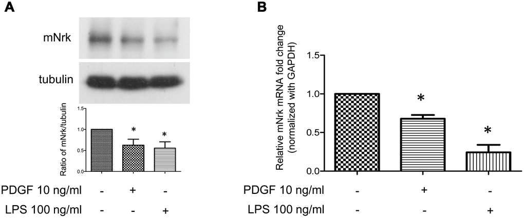 Reduced expression of Nrk in platelet-derived growth factor (PDGF) or lipopolysaccharide (LPS)-treated mVSMCs and arterial intimal hyperplasia in mice