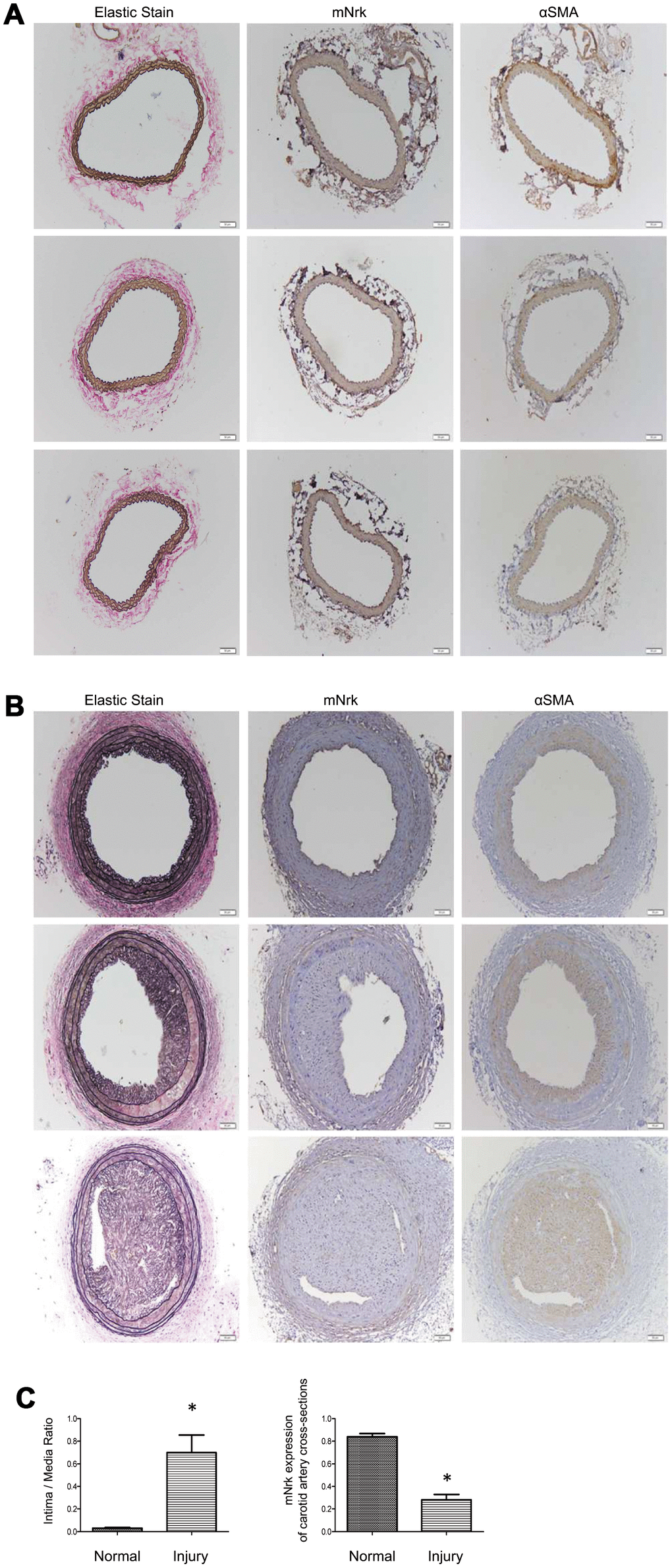 Carotid arteries were harvested on day 28 and fixed in 10% formaldehyde. Paraffin cross-sections were prepared at a thickness of 5 μm and stained with antibodies against CD31 (Abcam, Cambridge, UK), alpha smooth muscle Actin (αSMA, Sigma-Aldrich), hNrk (MyBioSource Inc.), mNrk (custom made, sequence: CLNNDPKSKKRQKAM) and calponin 1 (Santa Cruz Biotechnology, Dallas, Texas, USA) followed by the N-Histofine® MOUSESTAIN KIT (Nichirei Biosciences Inc., Tokyo, Japan) and Polink-2 Plus HRP anti Rabbit Detection Kit (GBI Labs, Mukilteo, WA, USA). At least three sets of sections at 150-μm intervals were used for morphometry of each arteries. Digitized images of H&E and elastic staining (Elastic Stain Kit, Sigma-Aldrich) were analyzed using Image-Pro Plus 6.0 (Media Cybernetics, USA) to calculate the intimal area to the medial area ratio (I/M).