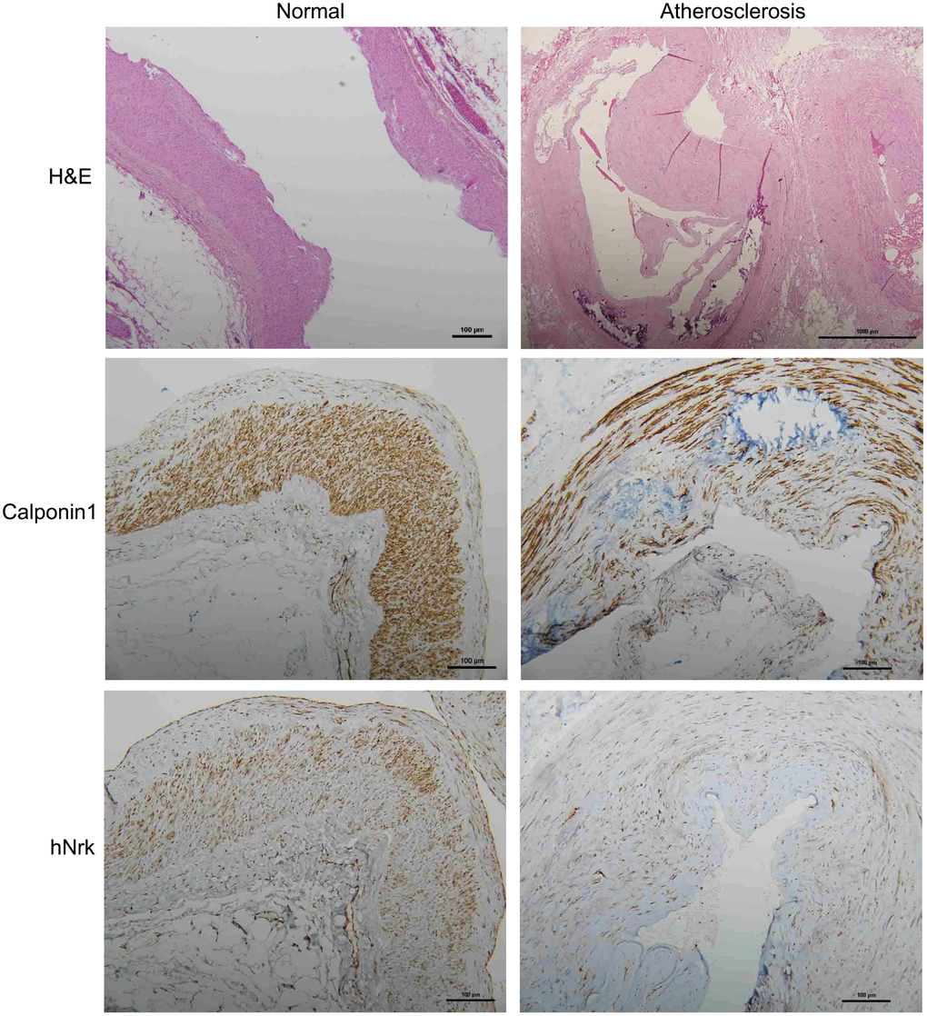 To further investigate the expression of Nrk in atherosclerotic vessels, we examined the expression of Nrk in 47 human vessel samples (including 15 normal and 32 atherosclerotic vessels involving trauma or diabetic foot) by IHC staining. We found that Nrk was positively stained in smooth muscle regions of normal vessels (Figure 4, left panel). The expression of Nrk was significantly decreased in atherosclerotic regions (Figure 4, right panel) when compared to non-atherosclerotic areas. Moreover, quantified Nrk expression was correlated with clinicopathological characteristics including sex, age, diabetes status, hypertension, ischemic heart disease, and diagnosis groups (Table 1). Reduced Nrk expression was significantly associated with diabetes (p < 0.001), hypertension (p = 0.005), ischemic heart disease (p = 0.021) and atherosclerosis (p < 0.001) (Table 1). These results confirmed the finding that Nrk expression is reduced during the pathological progression of atherosclerosis or arterial intimal hyperplasia.