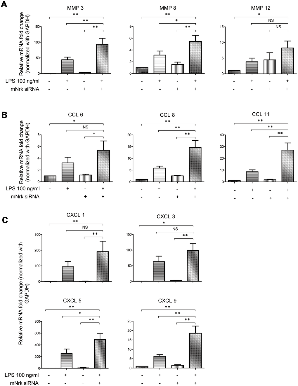 To investigate potential downstream regulators modulated by Nrk, we performed gene expression profiling by microarray analysis in Nrk siRNA- and LPS-treated mVSMCs (Supplementary Tables 1 and 2). Knockdown efficiency of Nrk in mVSMCs was confirmed by western blotting and qPCR (Supplementary Figure 6), and the results of mRNA expression quantitation from microarray analysis were validated by qPCR. Intriguingly, we found that several inflammation regulatory factors, including MMPs and chemokines, were induced by either Nrk siRNA or LPS in mVSMCs. Silencing of Nrk and LPS treatment synergistically increased MMP3, MMP8, MMP12, CCL6, CCL8, CCL11, CXCL1, CXCL3, CXCL5 and CXCL9 expression (Figure 5). Although it was not statistically significant, expression of IL-6 was increased in Nrk siRNA and LPS-treated mVSMCs (Supplementary Figure 7). These results suggested that Nrk may play an anti-inflammatory role during the pathological progression of arterial intimal hyperplasia by suppression of inflammatory factors and proteases.