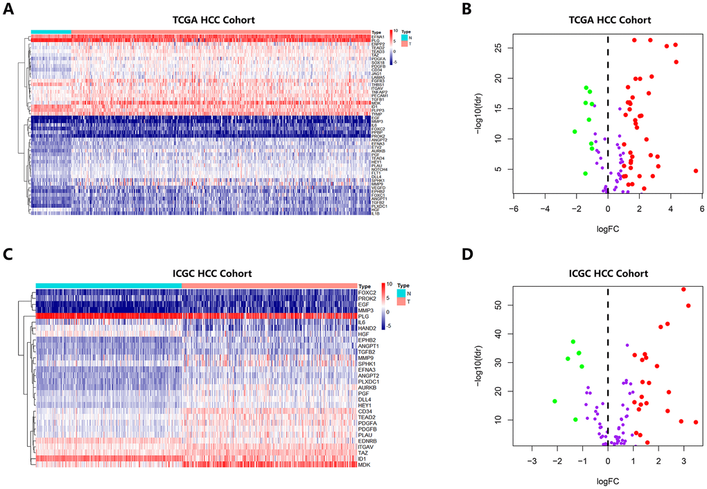 A total of 132 angiogenic genes were matched with HCC-associated mRNA obtained from the RNA-sequencing platform in TCGA database and the ICGC database to identify angiogenic genes associated with HCC. Then, we determined the differentially expressed genes (DEGs) by limma, an R package, with an absolute log2-fold change (FC) > 1 and an adjusted P value < 0.05.