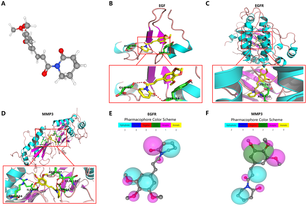 In exploring the clinically targeted therapeutic value of the four angiogenic genes, we identified piperlongumine as an inhibitor of the EGF/EGFR axis through the Cancer Therapeutics Response Portal (CTRP) database (http://portals.broadinstitute.org/ctrp/). (Supplementary Figure 4). Piperlongumine is an amide alkaloid of Piper longum L. (long piper) that exhibits cytotoxicity against a variety of human cancer cell lines and exhibits antitumor activity in rodents [22]. The 3D structure of piperlongumine is shown in Figure 10A. To investigate the effect of piperlongumine on the angiogenesis signature, we first used Autodock software (Version 3.6.1) to dock piperlongumine and angiogenic genes, and we found that piperlongumine could effectively dock to specific sites of EGF, EGFR and MMP3 (Figure 10B–10D, Supplementary Figure 5). When further validation was performed using PharmMapper (http://www.lilab-ecust.cn/pharmmapper/), we found that EGFR and MMP3 were potential targeting regulators of piperlongumine (Figure 10E–10F).
