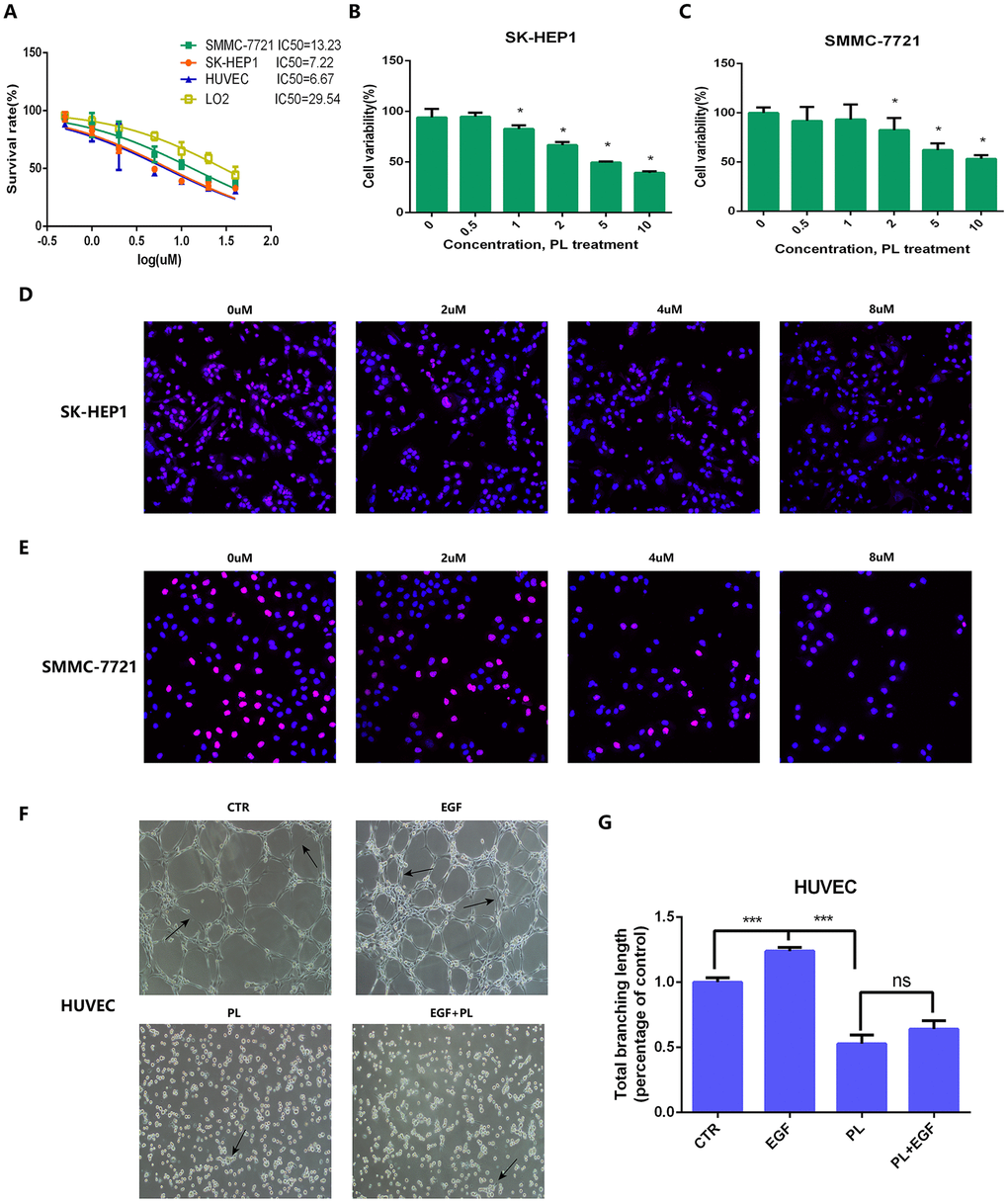 To further verify whether piperlongumine had anti-tumor effects on HCC, we performed in vitro cell proliferation experiments and tube formation experiments. In the Half Maximal Inhibitory Concentration (IC50) assay, the IC50 of piperlongumine was found to be 7.22 μmol in the SK-HEP1 cell line, 13.23 μmol in the SMMC-7721 cell line, 6.67 μmol in the HUVEC cell line, and 29.54 μmol in human LO2 hepatocytes, indicating that HCC cell lines (SK-HEP1 and SMMC-7721) were much more sensitive than human LO2 hepatocytes to piperlongumine (Figure 11A). To assess the effect on tumor cell proliferation in vitro, we treated SK-HEP1 and SMMC-7721 cell lines with different concentrations of piperlongumine and evaluated them by CCK8 assay, and EdU assay. We found by the CCK8 assay that piperlongumine treatment inhibited cell proliferation in a dose-dependent manner (Figure 11B, 11C), and the EdU assay further confirmed this result (Figure 11D–11E). To investigate the effect of piperlongumine on angiogenesis in the EGF/EGFR signaling pathway, we performed an in vitro HUVEC tube formation assay. The results suggested that piperlongumine inhibited angiogenesis via the EGF/EGFR axis signaling pathway (Figure 11F–11G).