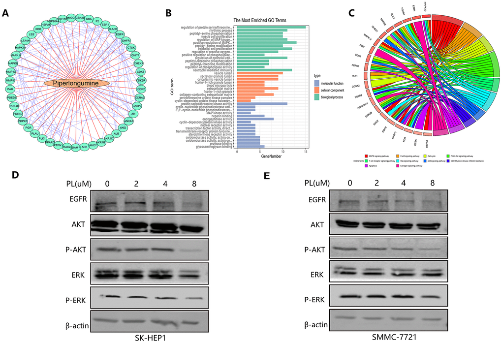 Because we have demonstrated that the anti-tumor effect of piperlongumine was achieved by inhibiting proliferation and angiogenesis, we attempted to clarify the specific mechanism of piperlongumine on HCC cells. In the Cancer Therapeutics Response Portal (CTRP) database (http://portals.broadinstitute.org/ctrp/), we found that 226 genes could be regulated by piperlongumine, and the coexpression features of the corresponding encoded proteins are shown in Figure 12A. Gene Ontology (GO) and Kyoto Encyclopedia of Genes and Genomes (KEGG) pathway enrichment analyses were performed on these 226 genes. The results suggested that piperlongumine could cause changes in the EGFR tyrosine kinase inhibitor resistance pathway (P<0.01) (Figure 12B, 12C). To further validate the specific mechanism of piperlongumine, we treated SK-HEP1 and SMMC-7721 cells with different concentrations of piperlongumine and then performed western blot assays. As shown in Figure 12D, 12E, piperlongumine treatment reduced the levels of EGFR, p-Akt and p-Erk in a dose-dependent manner, suggesting that piperlongumine inhibited angiogenesis-induced tumorigenesis by targeting EGFR to influence the EGFR/EGF signaling pathway.