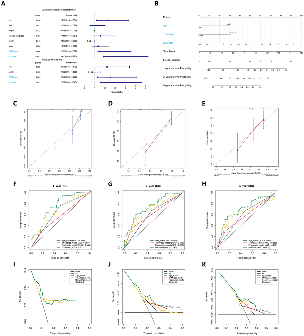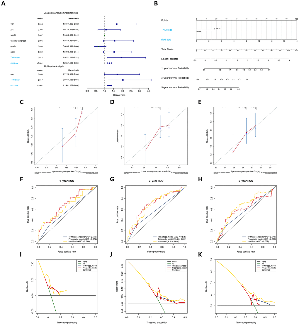 To evaluate the independent predictive value of this prognostic signature, we performed univariate and multivariate Cox regression analyses on the risk score of the prognostic signature and clinical characteristics (AFP, weight, vascular tumor invasion, sex, pathological grade, and TNM stage) of 370 HCC patients in the cohort from TCGA. The results of the univariable Cox regression analysis showed that age, TNM stage and the risk score of the prognosis signature had predictive value for OS (HR>1.00, P < 0.05), while AFP, weight, vascular tumor invasion and sex were not associated with OS. Therefore, we incorporated age, TNM stage, and risk score of the prognostic signature in a multivariate Cox regression analysis, and the results showed that TNM stage (HR = 1.961, P < 0.05) and the prognostic signature (HR = 1.315, P < 0.05) were important independent prognostic factors for OS (Figure 3A). To provide clinicians with a quantitative method to more accurately predict the prognosis and survival status of HCC patients, thereby contributing to more individual clinical decisions and treatment options, we constructed a predictive nomogram, which integrated the two independent prognosis factors based on the multivariable Cox regression analysis (Figure 3B). Each independent prognosis factor was assigned a certain score scale, and the total point value was obtained by adding up the specific points corresponding to the individual's prognosis variable, thereby determining the corresponding OS for the individual at 1, 3, and 5 years. The calibration curves of the nomogram at 1, 3, and 5 years were very close to the best prediction curve, showing a great consistency between the predicted OS rates and the actual observations (Figure 3C–3E).