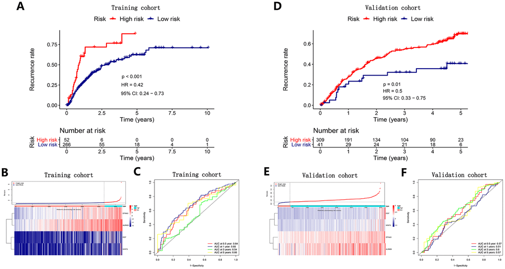 We utilized the regression coefficient (β’) of a multivariate Cox proportional hazards model based on four angiogenic genes and patients with release-free survival (RFS) time and recurrent status in the cohort from TCGA and the GSE14520 cohort. Then, we further constructed a recurrence signature as follows: prognostic index (PI) = (β’* expression level of EGF) + (β’* expression level of MMP3) + (β’* expression level of AURKB) + (β’* expression level of EFNA3). Determining the optimal cut-off value by X-tile software, HCC patients were divided into high-risk and low-risk groups. We found that the recurrence rate in HCC patients in the high-risk group was dramatically higher than that of the low-risk group in the same period in the cohort from TCGA (P<0.001) (Figure 4A) and the GSE14520 cohort (P=0.01) (Figure 4D). The distribution of risk scores corresponding to the expression patterns of the angiogenic genes is presented in Figure 4B, 4E. The AUC values for the 0.5-, 1-, 3-, and 5-year recurrence probability with the recurrence signature reached 0.64, 0.68, 0.54 and 0.66 in the cohort from TCGA, respectively (Figure 4C). In addition, the AUCs for 0.5-, 1-, 3-, and 5-year recurrence probability with the recurrence signature reached 0. 57, 0.51, 0.6 and 0.57 in the GSE14520 cohort, respectively (Figure 4F). These results showed that the recurrence signature had a great predictive power for recurrence.