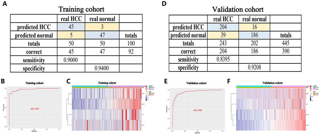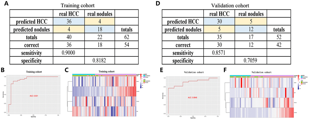 Furthermore, to improve the early screening rate of HCC and reduce the probability of misdiagnosis, we integrated these four angiogenic genes to establish a diagnostic model in the GSE89377 dataset (containing 22 proliferative nodules samples and 40 HCC samples) to detect whether the diagnostic model could correctly distinguish between HCC and proliferative nodules. We used a stepwise logistic regression method to establish the diagnostic model with a diagnostic formula of logit (P = HCC) = -5.58 + (5.84 × ENFA3 expression level) + (1.84 × EGF expression level) + (-1.04 × MMP3 expression level) + (18.10 × AURKB expression level). The diagnostic model was confirmed to distinguish between HCC and proliferative nodules with high specificity (81.82%) and high sensitivity (90.00%) (Figure 7A). The AUC for the diagnostic model was 0.931, confirming that the diagnosis model had diagnostic capabilities superior to those of other methods (Figure 7B). We then applied this diagnostic model to GSE6764 to further validate its diagnostic performance. The results showed that the diagnostic model had a specificity of 70.59%, a sensitivity of 85.71% (Figure 7D), and an AUC of 0.8848 (Figure 7E), demonstrating that the diagnostic model correctly distinguished HCC and hyperplastic nodules. Figures 7C, 7F show different angiogenic gene expression levels, the correspondence between the predicted results in the diagnostic model and the actual results.