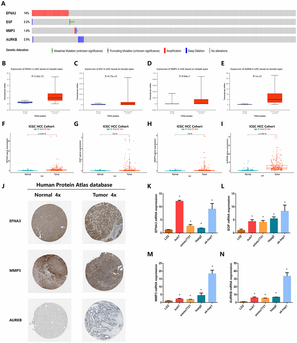 To examine the value of these four angiogenic genes (ENFA3, EGF, MMP3, and AURKB) for the construction of diagnostic, prognostic and recurrence models, we analyzed the expression patterns of the angiogenic genes in the HCC cohorts from ICGC database and different online database, including cBioportal, UALCAN and Human Protein Atlas database. We first performed genetic alteration detection in the HCC cohort from cBioportal database [19]. It was found that 20.1% (72 HCC samples) showed genetic alterations, 14% of which occurred in ENFA3, where the main alteration was amplification; 5 mutations occurred in EGF (2.2%) (Figure 8A). These genes have the potential to become targeted therapeutic sites and provide new therapeutic targets for the treatment of HCC. Subsequently, in the HCC cohort from UALCAN database [20], we found that the expression levels of the four angiogenic genes in tumor tissues were significantly higher than it was in normal tissues (P < 0.001) (Figure 8B–8E), and this finding was also consistently validated in the ICGC HCC cohort (P < 0.001) (Figure 8F–8I). In addition, to verify the clinical relevance of these four angiogenic genes, we analyzed the expression of proteins encoded by the four genes in clinical HCC specimens and normal specimens from the Human Protein Atlas database [21]. The results showed that ENFA3, MMP3 and AURKB were strongly positive in HCC tissues compared to normal liver tissues (Figure 8J), while EGF was not found in the database. The expression characteristics of angiogenic genes were consistent with the prognosis and recurrence analysis, and the finding indicated that the expression characteristics of these four genes are of great value for constructing diagnostic, prognostic and recurrent models. In addition, the expression levels of the four genes in different cell lines are shown in Figure 8K–8N.