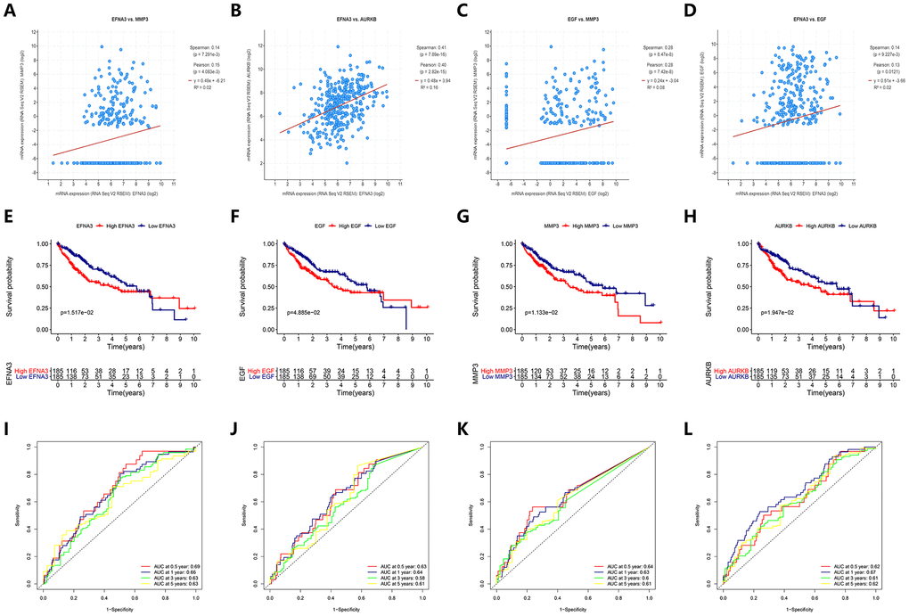 Since these four angiogenic genes were highly expressed in HCC patients and were risk factors, we explored the expression correlation of these four genes. We found that ENFA3 and MMP3 have synergistic effects, and their expression levels were positively correlated (Pearson 0.15, P<0.05) (Figure 9A). This result was also verified among other genes (ENFA3 and AURKB, EGF and MMP3, EFNA3 and EGF) (P<0.05) (Figure 9B–9D), while the expression level of AURKB was not significantly correlated with the expression levels of EGF or MMP3 (P>0.05). These results suggested that there was a relationship between these genes and their expression, further contributing to the occurrence of HCC. To verify the association between the expression levels of these four angiogenic genes and the OS of HCC patients, we performed K-M curve analysis of the HCC cohort from TCGA. The analysis showed that the OS of HCC patients with high expression of EFNA3 was significantly lower than that of patients with low expression of ENFA3 (P<0.05). EGF, MMP3 and AURKB also had consistent results; that is, high expression of these genes corresponded to low OS (Figure 9E–9H). The AUCs for 0.5-, 1-, 3- and 5-year OS indicated a great predictive performance based on the expression of the four genes (Figure 9I–9L).