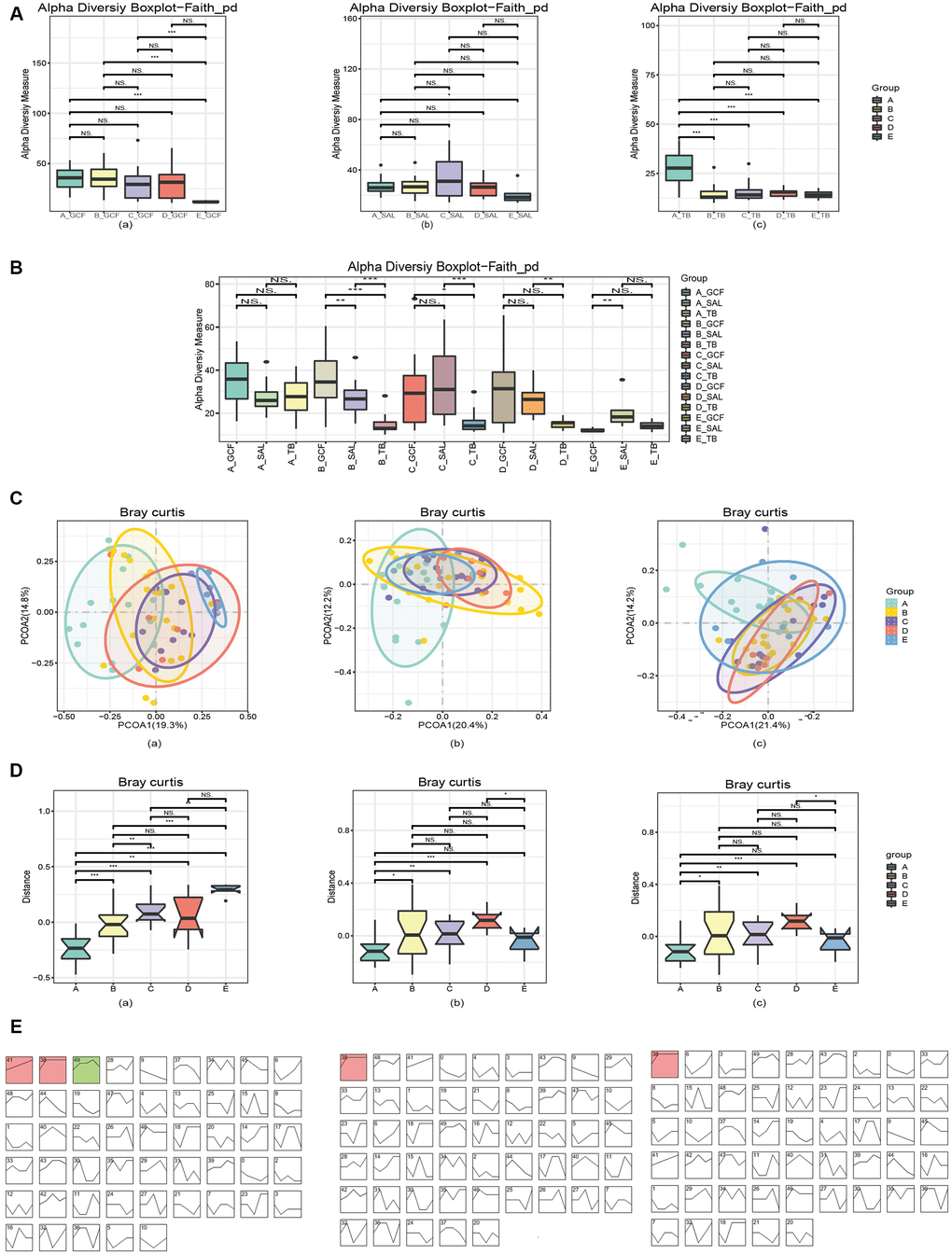 To compare the differences in oral microbiota among different age groups, the α-diversity of the oral microbiota relative to age and oral site was first explored. Microbial OTUs within each oral site were analyzed by ANOVA, and the results showed that the OTUs within GCF or TB had marked reductions with age (Supplementary Figure 2, p=0.0029 and 0.0001, respectively). Meanwhile, the bacterial OTUs in GCF decreased gradually with age, whereas there was no difference between groups B-E for TB; however, the OTU was significantly larger in group A than in the older groups. The Faith_PD diagrams also demonstrated the distinction of microbial within-sample diversity between different age groups within each site (Figure 1A). The variation trends of Faith_PD in GCF, SAL and TB were similar to that of OTUs. Additionally, an intersite comparison was performed on the bacterial α-diversity within each age group, and the cross-site pattern of Faith_PD revealed differentiation in α-diversity between various oral sites. The α-diversity differed between at least two sites except group A (Figure 1B), further demonstrating the distinction of bacteria in different oral sites and age-related variation.