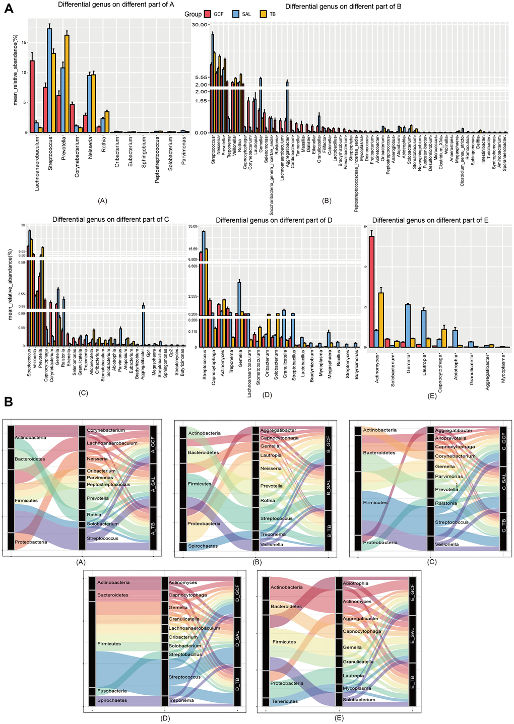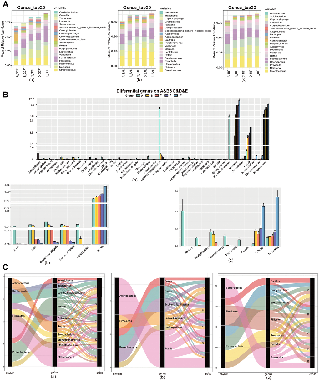 To clarify the effects of age on oral microbiota, we then compared the structure of oral microbiome at the genus and species levels. At the genus level, Streptococcus, Neisseria, Haemophilus, Prevotella and Fusobacterium were dominant in all three sites (Figure 2A). Comparing the abundance of bacterial genera between the age groups, 88, 44 and 47 genera were found to have marked variation with age in the GCF, SAL and TB sites, respectively (Supplementary Figure 6). Meanwhile, 39, 6 and 7 genera enhanced or reduced their contents continuously with age in the GCF, SAL and TB sites, respectively (Figure 2B and Supplementary Figure 7, Supplementary Table 5); i.e., their trends were not changed in the age groups. Among all the genera shifting up or down gradually in all three sites, Delftia, Escherichia/Shigella, and Herbaspirillum were reduced in both the GCF and SAL sites while the Rothia content increased in the two sites. Similarly, Bradyrhizobium, Brevundimonas, Pelomonas and Serratia decreased their abundance with age in both the GCF and TB sites (Figure 2B and Supplementary Table 5). There was no overlap between the SAL and TB sites. At the species level, Haemophilus parainfluenza, Veillonella dispar, Porphyromonas catoniae and Prevotella jejuni were dominant, with Haemophilus parainfluenza having the highest abundance in all three sites (Supplementary Figure 8). Among the species of bacteria included in all age groups, 75, 24 and 49 species were found to have significant age-related variation in the GCF, SAL and TB sites, respectively (Supplementary Figure 9). Meanwhile, 14, 2 and 4 species varied continuously with upward or downward trends in the GCF, SAL and TB sites, respectively (Supplementary Figure 10 and Supplementary Table 5). In GCF, Acinetobacter spp., Actinomyces spp., Anaeroglobus geminatus, Bifidobacterium longum subsp. infantis, Propionibacterium acnes, Pseudomonas beteli, Sphingomonas xenophagum, Treponema maltophilum, Oribacterium sinus, Prevotella nanceiensis, Solobacterium moorei, and Stomatobaculum longum changed their contents with age continuously; in SAL, Faecalibacterium prausnitzii and Fusobacterium mortiferum had a trend of variation; and in TB, Eubacterium sulci, Feacalibacterium prausnitzii, Porphyromonas gingivalis and Tannerella forsythia changed their contents gradually (Supplementary Table 5). Among these species with trends, only Feacalibacterium prausnitzii decreased in abundance with age in more than one site (SAL and TB) (Supplementary Table 5). The phyla to which the different genera belong were displayed by the Sankey diagram, and the results demonstrated that the different genera harboring GCF and SAL with prevalence all belong to the phyla Firmicutes and Proteobacteria (Figure 2C); meanwhile, other genera in TB belonging to Bacteroidetes were also found. The above results suggest that the microbial composition changes with age, and the patterns of variation in different oral sites were divergent. Afterward, we performed an intersite comparison of the microbial community within each age group at the genus and species levels. At the genus level, 12, 56, 28, 18 and 9 genera were differentially distributed across the sites for the age groups A to E, respectively (Figure 3A and Supplementary Figure 11, Supplementary Table 6); the number of differential genera demonstrated a trend of a bell-shaped curve (increasing first and then decreasing) with age (Figure 3A and Supplementary Figure 11). The cross-site differential genera included Prevotella, Rothia, Solobacterium, etc., but only Solobacterium was shared by all age groups (Supplementary Figure 12, Supplementary Table 6). At the species level, 10, 72, 43, 17 and 25 species showed significantly varied intersite distribution with age, respectively (Supplementary Figures 13, 14, Supplementary Table 6). The number of cross-site differential species also formed a bell-shaped curve in aging mouth. The intersite differential species included Prevotella spp., Actinomyces spp., and Solobacterium spp., etc., but only Actinomyces odontolyticus and Solobacterium moorei were shared by all age groups (Supplementary Figure 12 and Supplementary Table 6). The phyla to which the intersite differential genera belong were displayed by the Sankey diagram, and the results demonstrated that the different genera in Group A all belonged to the phyla Actinobacteria, Firmicutes and Proteobacteria (Figure 3B), whereas more differential genera belonged to the phyla Bacteroidetes and Teneriquetsas as the host age increased. The results above indicate the separation in the patterns of bacterial composition in various sites of aging mouth, and the number of intersite differential bacteria followed bell-shaped trend in response to aging.