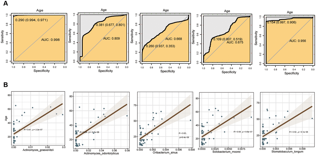To explore the feasibility of using oral bacteria to assess mouth age or maturity, the random forest classifier model was employed for distinguishing different age groups. The data preparation of the random forest model was performed with 5-fold cross-validation, i.e., the original data was randomly divided into 5 sub-groups in each age group firstly; then, using a random sub-group as the test set, the remaining 4 sub-groups were used as training groups. The differential bacteria species with trends of GCF were first evaluated by the random forest model (Supplementary Figure 17), and the results showed that application of trending differential bacteria as a biomarker to distinguish Group A, B, C, D, and E could reach an accuracy of 0.998, 0.809, 0.668, 0.675 and 0.956, respectively (Figure 6A). The SAL and TB sites had many fewer different bacteria species than GCF, so the accuracy rates were relatively lower; the value was 0.804, 0.677, 0.835, 0.642 and 0.620 for Group A-E for SAL, respectively; and 0.831, 0.597, 0.515, 0.663 and 0.631 for Group A-E for TB, respectively (Supplementary Figures 18, 19). Meanwhile, Actinomyces odontolyticus, Oribacterium sinus and Solobacterium moorei were used for linear fitting of the age groups B, C, and D, and much smaller p-values were obtained (Figure 6B).