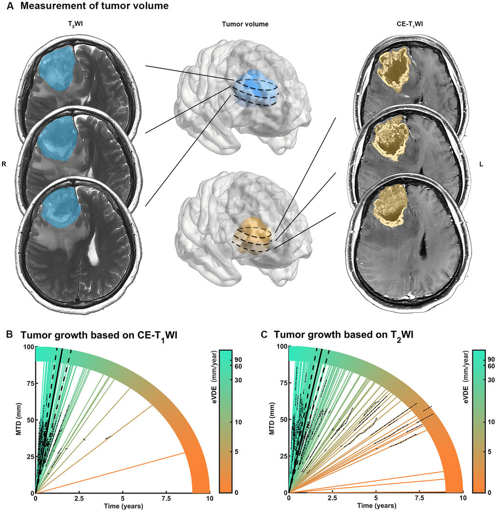 High-grade gliomas (HGGs; World Health Organization [WHO] grades III and IV) [1] are classified as highly malignant due to their fast growth rates and extreme invasiveness [2]. Standard therapy includes maximum neurosurgical resection and adjuvant therapy. Tumor growth rate directly reflects the radiological expansion of HGGs. Several mathematical models to predict the growth rate of gliomas have been proposed in previous studies [3–5]. Apart from volume-doubling time (VDT), [6] tumor growth can be evaluated using equivalent evolution of the tumor radius or diameter, which construct linear growth models [5, 7, 8]. As reported previously, the median velocity of radial expansion of glioblastomas is 29.6 [8] – 30 mm/year [5]. Slower tumor growth rates have been associated with longer survival times [9]. Compared with survival time, tumor growth rate better reflects the inherent characteristics and radiology expansion of the tumor, as this objective value is not influenced by therapy strategy [10, 11].