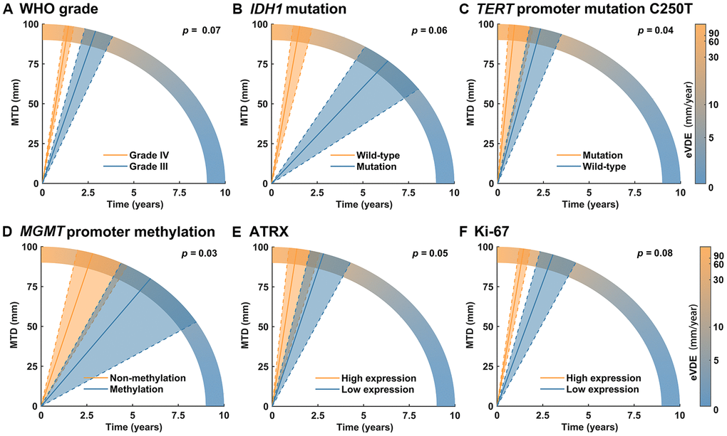 To further investigate the association of molecular biomarkers with tumor growth, combinations of molecular biomarkers were introduced into interaction terms. After adjusting for WHO grade, ATRX, Ki67, and MGMT, the IDH1, TERT, and 1p/19q molecular groups were independently associated with tumor growth. HGGs with TERT promoter mutation (C250T or C228T) only had a significantly faster growth rate than other groups. After adjustment for WHO grade, ATRX, Ki67 and TERT, the molecular groups of IDH1 and MGMT were independently associated with tumor growth. HGGs with IDH1 wild type and MGMT promoter methylation had a significantly faster growth rate than other groups. After adjustment for WHO grade, MGMT, Ki67, and TERT, molecular group of IDH1 and ATRX were associated with tumor growth in univariable analysis but not in the multivariable model. (Table 4, details of the WHO grade and other molecular biomarkers are shown in Supplementary Table 4).