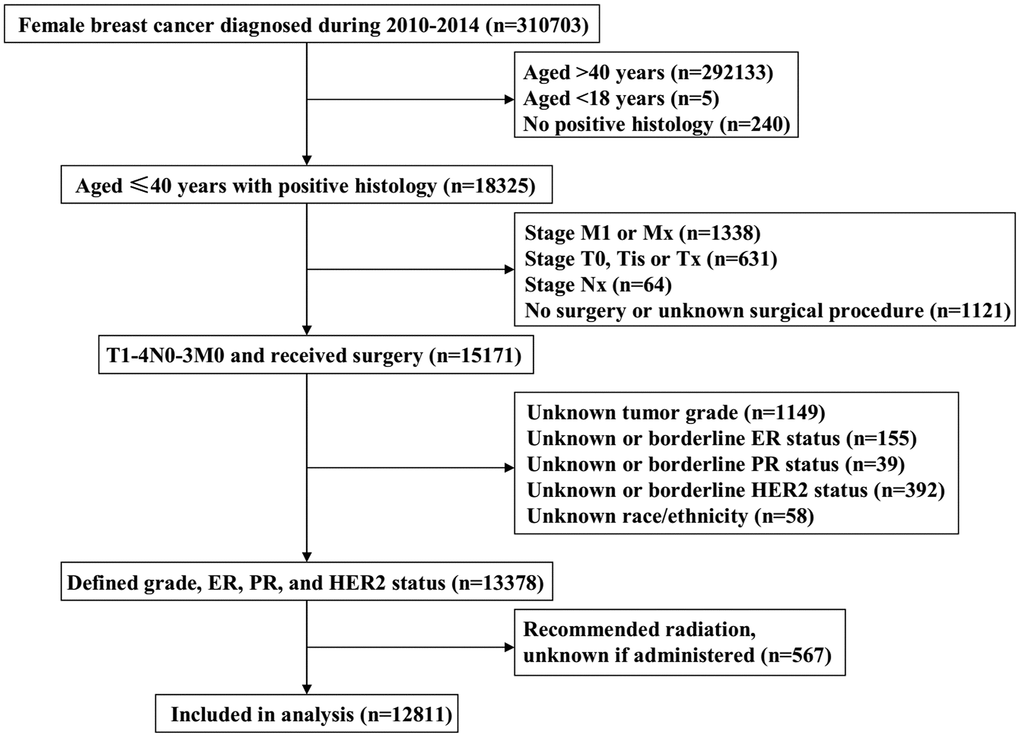 Young women diagnosed with breast cancer from 2010 to 2014 were identified using the SEER database. SEER database is a population-based cancer registry, which including information on cancer incidence, demographic and tumor features, the first course of treatment, and outcomes for approximately 28% of the United States population [41]. We identified patients who met the following criteria: T1-4N0-3M0 invasive breast cancer; aged ≤40 years; treatment with breast-conservation surgery or mastectomy; available variables including tumor grade, ER status, PR status, HER2 status, and race/ethnicity. Patients with aged <18 years, non-positive pathological diagnoses, and unavailable of local treatment procedures were excluded. The present study was exempted from approval by the Institutional Review Board due to the de-identified information was included in the SEER program.