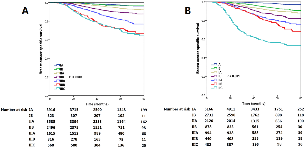 Next, we also performed a Cox proportional hazard analysis to compare the prognostic effect of the two stage groups on BCSS. The results showed that the 8th AJCC pathological prognostic staging system had superior overall discriminatory power to predict the BCSS. The hazard ratio (HR) of BCSS increased with the staging. When using stage IA as the reference, all categories in the 8th AJCC pathological prognostic stages showed worse BCSS with gradually increased HRs. In contrast, the 7th anatomic stages had no significant difference in BCSS using the multivariate prognostic analysis (Table 5).