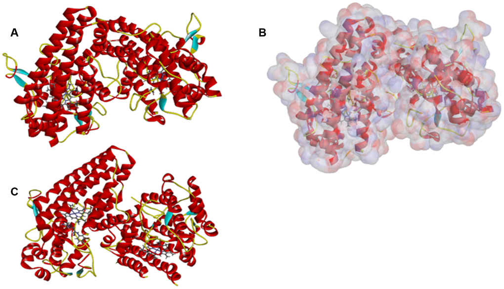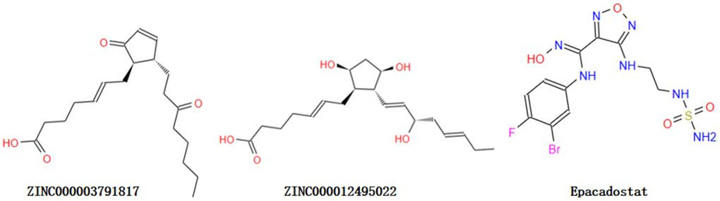 Through ADME module of Discovery Studio 4.5, we assessed drug-like properties of Epacadostat and favorable compounds, including BBB (brain/blood barrier), human intestinal absorption, aqueous solubility, CYP2D6 (cytochrome P450 2D6) binding, PPB (hepatotoxicity and plasma protein binding properties) (Table 2). The aqueous solubility assessing was carried out with suitable temperature of water at 25°C. As the results shown, all the compounds can dissolve well in water other than ZINC000118912913. 10 compounds had favorable solubility and Epacadostat had moderate solubility. For human intestinal absorption, 7 compounds and Epacadostat were absorbed with a secondary level, and 10 compounds were absorbed with a right level. And we find 12 compounds and Epacadostat interacted and combined with plasma protein tightly, and the rest was not. All compounds don’t inhibit cytochrome P450 2D6 (CYP2D6) other than ZINC000034944431, ZINC000002526389, ZINC000085886023, ZINC000002528510 and ZINC000100822245. Cytochrome P450 2D6 (CYP2D6) played a vital part in metabolism of drug. Epacadostat were predicted to be non-inhibitors of cytochrome P450 2D6 (CYP2D6) as well. For hepatotoxicity, 16 compounds were predicted as non-toxic, while the rest and Epacadostat were toxic. Then, though TOPKAT module of Discovery Studio 4.5, we also assessed Safety properties of the selected compounds and Epacadostat, including AMES, DTP and Rodent carcinogenicity. AMES is Ames mutagenicity. DTP is developmental toxicity potential. And Rodent carcinogenicity is based on the U.S. National Toxicology Program (NTP) dataset (Table 3). As the results shown, 9 compounds were not toxic in development. All results above indicated that compound 1 (ZINC000012495022) and compound 2 (ZINC000003791817) were favorable potential compounds as inhibitors of IDO. These two compounds above didn’t suppress CYP2D6’s activities and were not hepatotoxic. Moreover, they were almost not mutagenic, rodent carcinogenic and developmental toxic with the comparison of others. So these two selected compounds can be perspective target of inhibitor drug development for IDO. As Figure 1 shown, these two compounds and Epacadostat were similarly made up of several multiple reactive oxygens, dual-band in their chemical structures. And compound 1 (ZINC000012495022) and compound 2(ZINC000003791817)’s constructions were similar to Epacadostat. Moreover, the two candidate compounds and Epacadostat both bind with IDO at a same position, which is close to IDO’s ligand iron hemoglobin. In summary, these two compounds were safe. So we chose them as potential candidate compounds for following study (Figure 1).