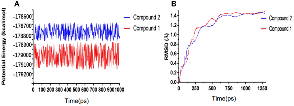 We have performed molecular dynamics simulation to assess if the complex of ligand-IDO is stable under natural environment. The results included RMSD curves and potential energy profiles (Figure 5). The RMSD curves of these complexes got equilibrium at about 200 ps. Moreover, RMSD as well as potential energy of these complexes got stable gradually. As results shown, hydrogen bonds and pi-s interactions between compounds and IDO greatly promoted these complex’s stability. So the complex of these two selected compounds and IDO can keep stable and have promotional effects under natural environment as Epacadostat did.