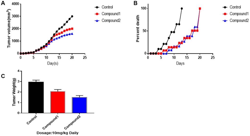 To make the results of the two selected compounds more convincing (Figure 6), we performed animal experiments. As figure 6 showed to us, compound 1 and 2 had a great advantage to suppress tumour growth, both in volume and weight, especially compound 2. After 12th day, compounds 1 and 2 made a significant difference in killing the tumour. As for tumour volumes, on 20th day, the control group was 3014 mm3, the tumour volumes treated by compounds 1 and 2 were 2010, 1560 mm3, independently (mean ± SEM, p<0.05). Additionally, as survival per cent chart shown, compounds 1 and 2 play an essential role in promoting survival period. What’s more, on 20th day, as tumour weight chart illustrated, control group’s final weight of tumour was 3.18g. Tumour weight treated by compounds 1 was 2.05g. Tumour weight treated by compounds 2 was 1.54g (mean ± SEM, p<0.01).