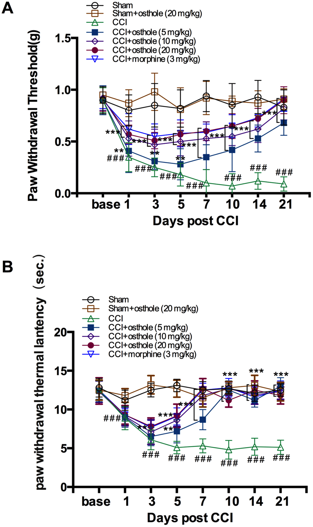 A CCI-induced pain model was used to explore the effect of osthole or morphine on neurodynia and behavior was assessed on POD 0, 1, 3, 5, 7, 10, 14 and 21. Behavioral research revealed that CCI induced a seriously pain hypersensitivity with a characteristic of mechanical allodynia and heat hyperalgesia compared to sham group, maintaining for over 3 weeks (Figs. 1A, B). In sham mice, the ipsilateral hind paws showed no difference in PWT and PWL at all the time point. In CCI mice, PWT was significantly decreased on POD 3, maintained on POD 7 and decreased from 0.90 ± 0.12g on POD 0 to 0.09 ± 0.07g on POD 21(Figure 1A). PWL of CCI mice changed in a similar way and decreased from 12.50 ± 1.21s on POD 0 to 5.13 ± 0.92s on POD 21(Figure 1B). We detected the influence of osthole and morphine on CCI-induced pain. Osthole (5, 10 or 20 mg/kg) severely reduced mechanical allodynia and heat hyperalgesia continued for at least 3 hours with the best repression 1-hour post osthole treatment compared to CCI group. The pain threshold values of osthole treatment and morphine treatment groups were raised day by day, reaching the level of the sham group on POD 10. Although high dose osthole obviously cut down mechanical allodynia and heat hyperalgesia in CCI-mice, it did not change the baseline thresholds in sham group, indicating osthole has an important role for neuropathic pain conditions. Moreover, high dose osthole showed an equal pain threshold compared with that of the morphine treatment group after POD 10.