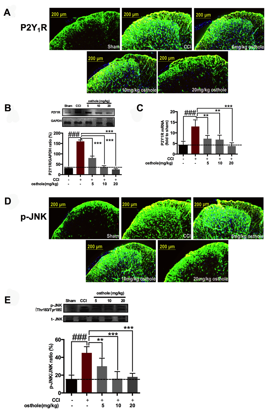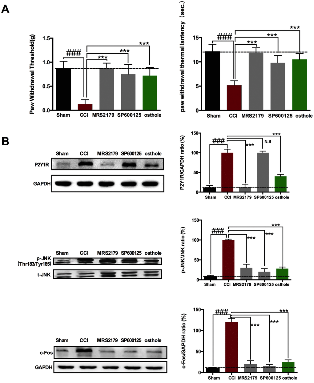 In the current study, we aimed to investigate the underlying mechanism of osthole treatment in neuralgia mice in spinal and determine whether P2Y1 receptor-dependent JNK signaling pathway in spinal astrocyte was involved in CCI induced neuropathic pain. We also explored whether pharmacological decreases in P2Y1R induced by osthole exerts an inhibitory effect on JNK. We expected that our research can provide more experimental basis for the application of osthole in clinic.