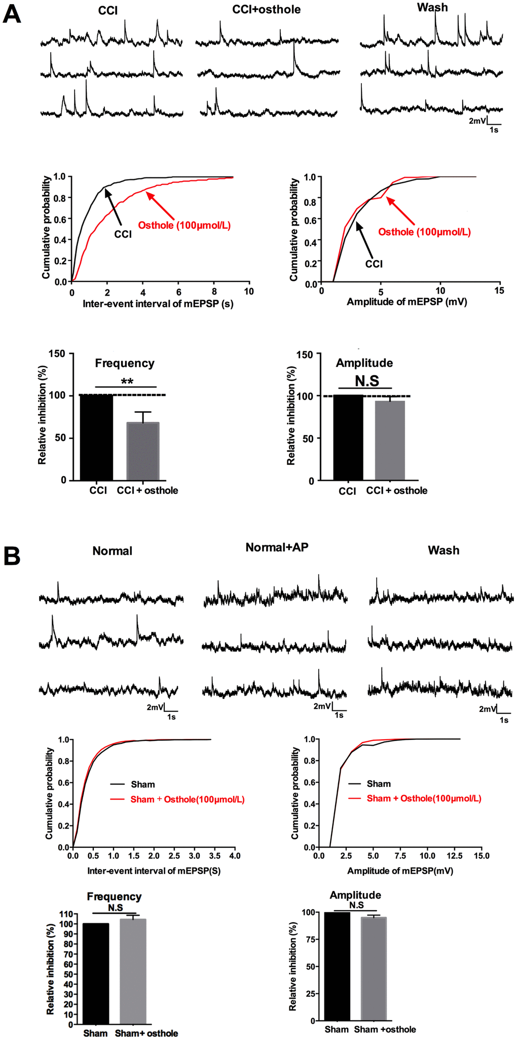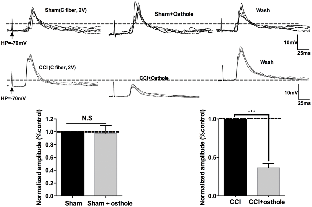 Signals deliver of nervous system is inseparable with synaptic transmission. Neuronal excitability represents the severity of neuralgia. In order to explore the effect of osthole on neuronal excitability, mEPSPs of lamina I-II neurons in CCI mice were detected with or without osthole perfusion. As shown in Figure 4A, mEPSPs frequency was depressed by 100 μmol/L osthole, but mEPSPs amplitude did not show significant changes. Furthermore, we checked mEPSPs of lamina I-II neurons of normal mice with or without osthole treatment. Figure 4B showed that osthole did not alter mEPSPs frequency and amplitude of normal mice. These findings suggest that osthole effectively inhibit excitatory synaptic transmission. We also tested the actions of osthole on excitatory synaptic inputs to neurons in lamina I-II from C fibers. As shown in Figure 5, a reproducible monosynaptic eEPSPs in the lamina I-II neurons was evoked. Osthole bath-applied for 10 minutes at a dose of 100 μmol/L. The amplitude of C fiber-evoked monosynaptic eEPSPs were significantly decreased by osthole compared with CCI group.