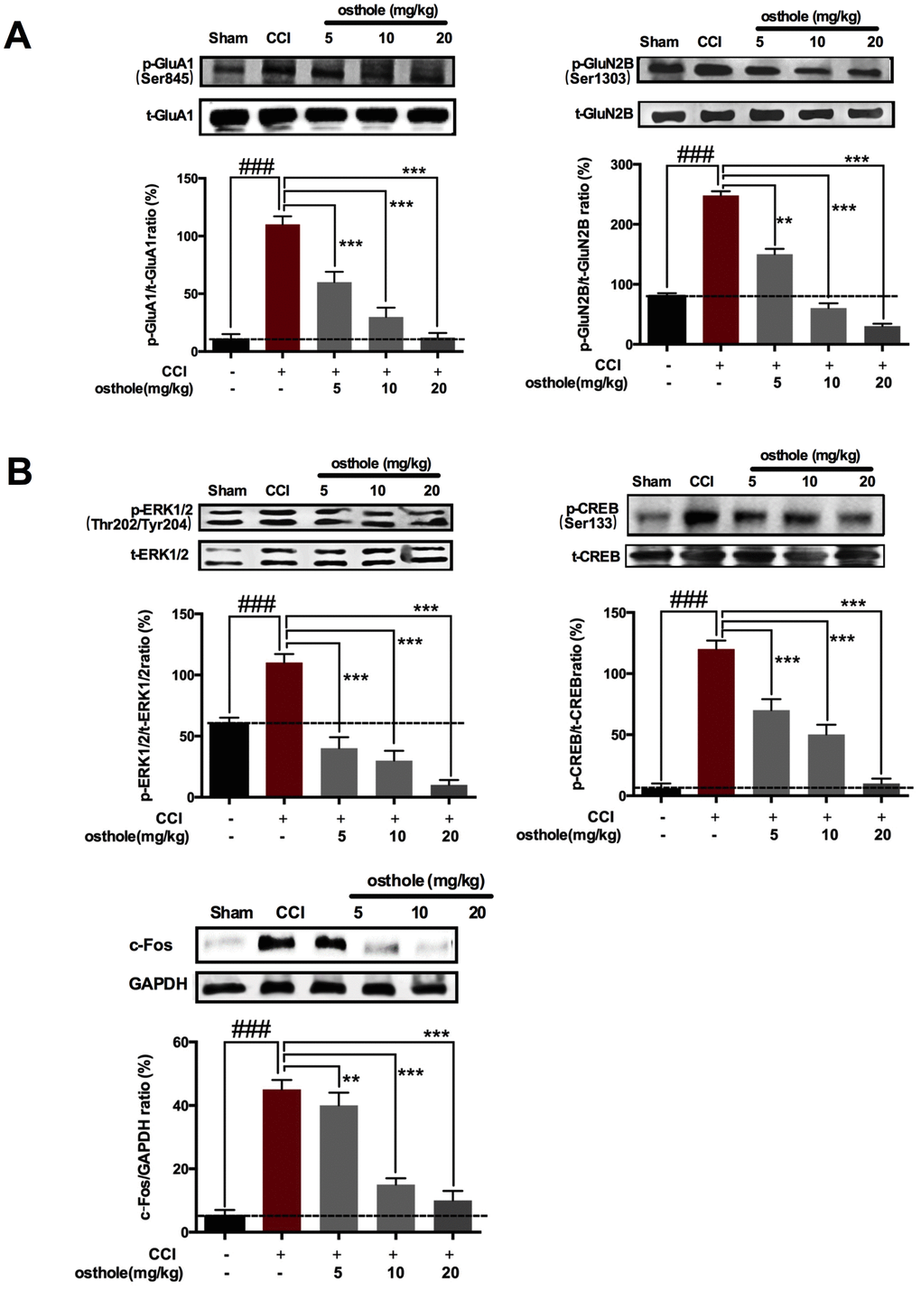 When inflammation cytokines and chemokines bind to their receptor, what happens in neuron as follows? Glutamate in presynaptic element liberation increased, causing glutamic acid receptor in postsynaptic element activated, such as AMPA and NMDA. Excitatory receptors in neurons leads to increased calcium influx [28], initiating a series of downstream signal pathways, including p-ERK, p-CREB and c-Fos, which are closely related with pain sensitivity [3]. Postsynaptic receptor was also detected to further prove the influence of osthole on neuronal excitability. The results showed that pGluA1 (ser845) and pGluN2B (S1303) were decreased after osthole treatment compared to CCI mice (Figure 6A). At the same time, pain-related signal molecules in neurons of CCI mice were checked. We found that CCI induced p-ERK, p-CREB and c-Fos increased compared to sham group, while osthole dose-dependently inhibited expression of p-ERK, p-CREB and c-Fos protein compared to CCI group (Figure 6B). In summary, osthole induced synaptic inhibitory effects and reduced neuronal excitability.