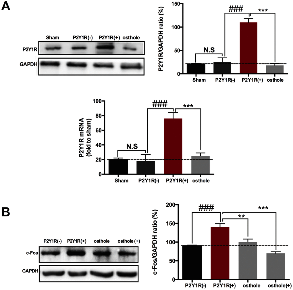 To prove the effect of osthole on P2Y1R, primary astrocytes transfect with a pcDNA3.1 vector contained P2Y1R sequence. Our results showed that P2Y1R sequence was successfully transfected into astrocyte, P2Y1R expression in transfected cells markedly increase compared to normal astrocyte. Meanwhile, osthole obviously decreased P2Y1R protein and gene levels (Figure 8A). We also detected c-Fos expression in primary neurons dealt with astrocyte-conditioned medium. Our research showed that astrocyte-conditioned medium induced the change trend of c-Fos consistent with that of P2Y1R. In astrocyte-conditioned medium pretreated with P2Y1R (+), expression of c-Fos significant increase and attenuated in osthole group. Meanwhile, c-Fos expression decreased further in osthole (+) group (Figure 8B). Data above indicated that the effect of osthole on P2Y1R in astrocyte leads to decrease of c-Fos expression in neurons and produces analgesic effect. Perhaps, osthole has some direct effect on neurons.