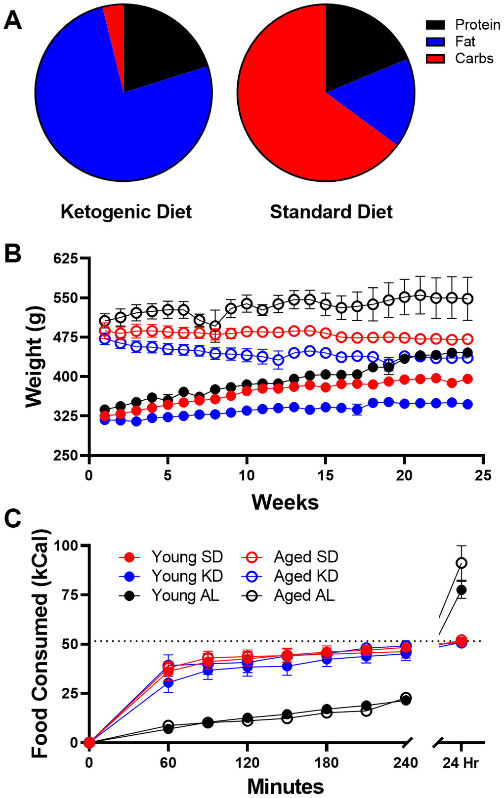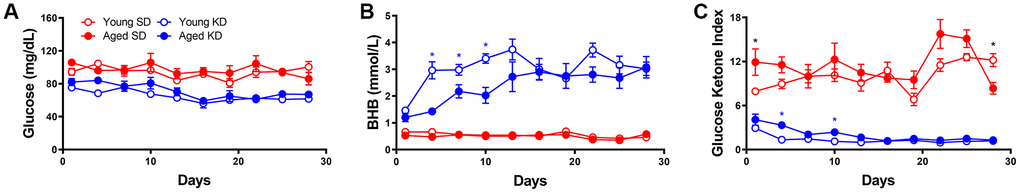 All data are expressed as group means ± standard error of the mean (SEM) unless otherwise reported. The glucose ketone index (GKI) was calculated as described in a previous publication [39]. Briefly, the glucose (mg/dL) was divided by the molecular weight of glucose (expressed as (mol/(g x dL))), and this value was then divided by the BHB value (mM). Differences across age and diet groups were analyzed using a two-factor ANOVA with the between subjects factors of age (2 levels: young and aged) and diet (2 levels: SD and KD or 3 levels: SD, KD and ad libitum). When time was a factor, an ANOVA-RM was used with the same factors. Post hoc analyses were done utilizing independent-samples t-tests where appropriate. Null hypotheses were rejected at the level of p > 0.05. All analyses were performed with the Statistical Package for the Social Sciences v25 (IBM, Armonk, NY) or GraphPad Prism version 7.03 for Windows (GraphPad Software, La Jolla, California USA).