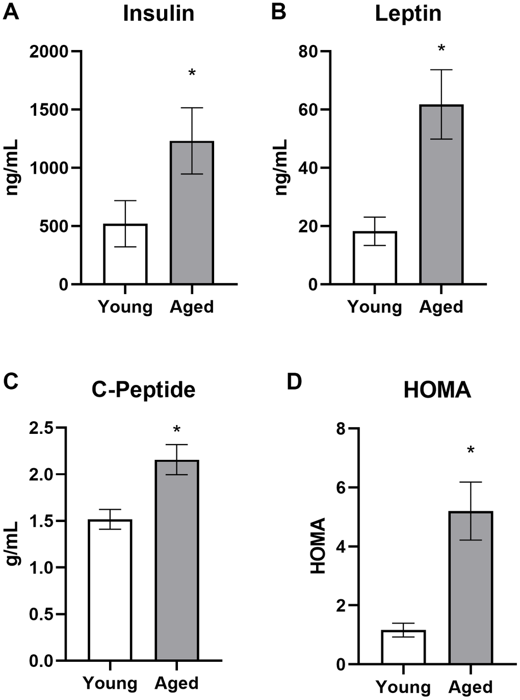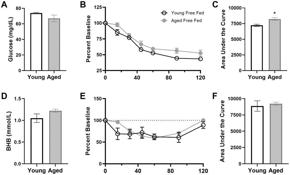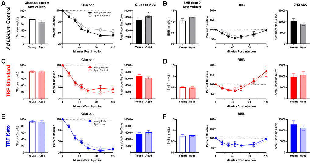 | Figure 6: Insulin tolerance testing | Young n = 6 Aged n = 5 | Young n = 7 Aged n = 7 | Young n = 7 Aged n = 6 |