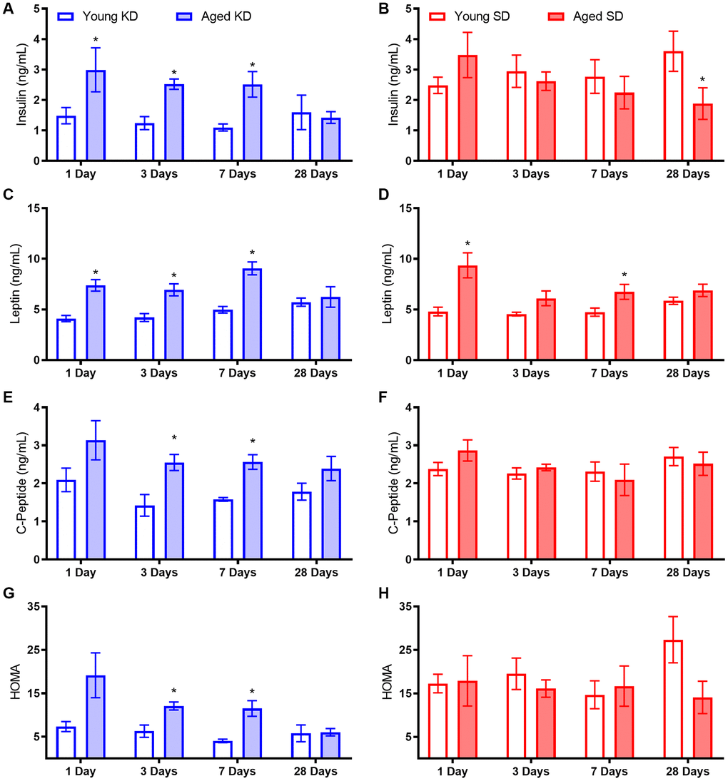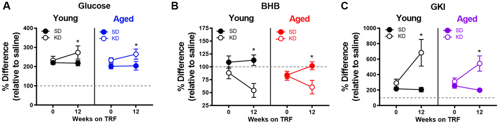 Aged rats had elevated fasting and postprandial insulin levels while ad libitum feeding with standard rodent chow, as well as during the initial stages of keto-adaptation. In young rats, fasting insulin levels decreased significantly following the first 24 hours of a KD. This decrease in fasting insulin was not observed in aged rats during the first week of a KD. In addition to insulin deficits, aged animals fed ad libitum with chow had significantly elevated leptin, c-peptide, and HOMA. While some metabolic factors were significantly improved following TRF with the SD, such as the insulin tolerance test, combining TRF with a KD was most efficacious at restoring metabolic markers in aged rats to levels comparable to young animals, as well as enhancing the epinephrine-induced increase in peripheral glucose.