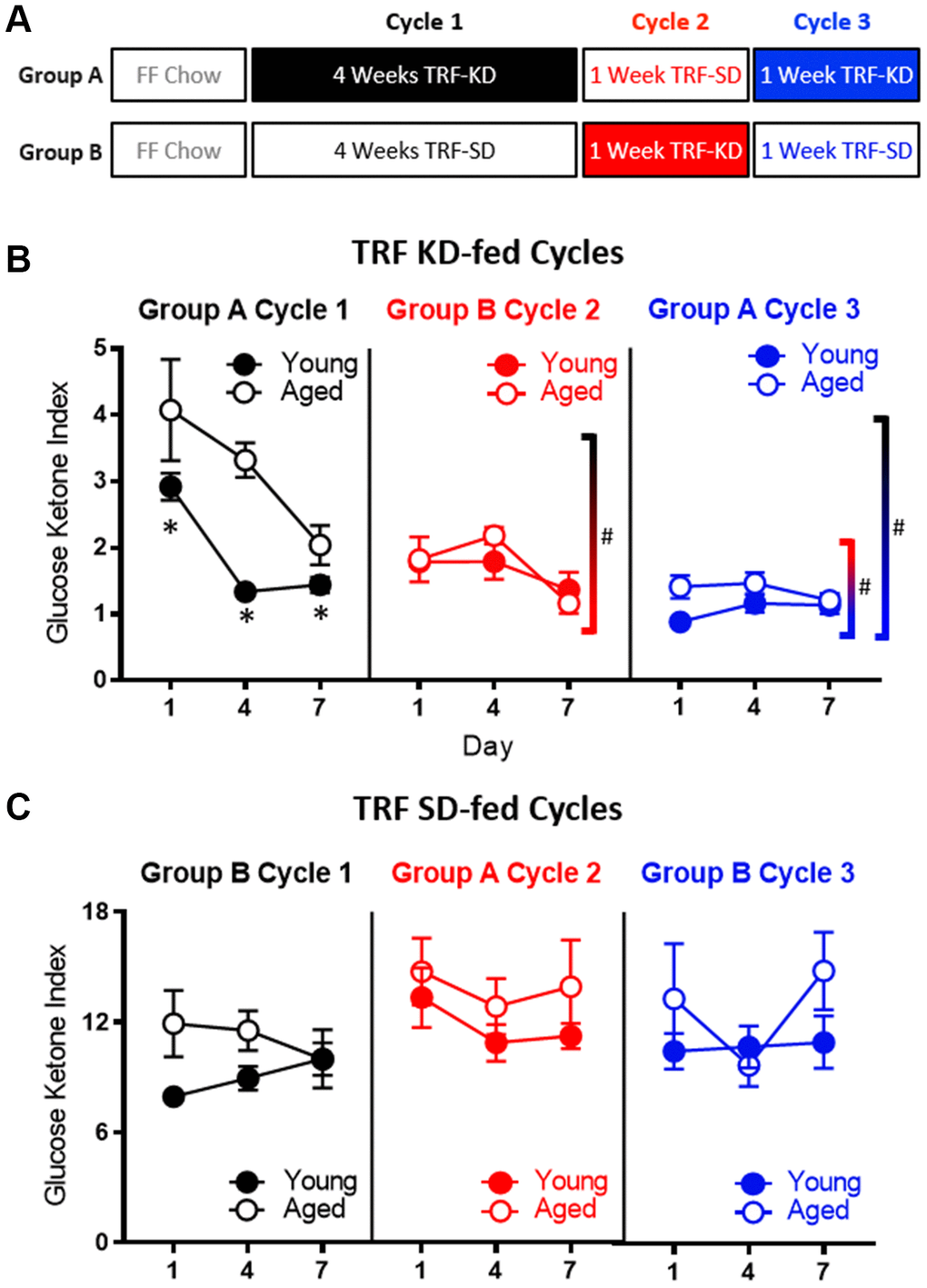 The TRF implemented in the current experiments was associated with a ~21 hour fast, as both young and aged rats consumed close to 100% of the available calories within 3 hours (Figure 1C). Because intermittent fasting [43] and the KD [44] have both been reported to improve insulin receptor sensitivity, as well as other markers of metabolic function, it is possible that either manipulation could enhance keto-adaptation in young and aged rats. To test this, young and aged rats were divided equally into groups A and B, with both groups receiving once daily TRF of 51 kcal as described previously with either the KD or SD for 6 weeks. Group A was placed on the KD for 4 consecutive weeks and then cycled onto the SD for 1 week, followed by a final week of the KD. Group B was placed on the SD for 4 weeks, followed by 1 week of the KD and a final week of the SD (Figure 7A). Blood glucose and BHB levels were collected every 3 days to calculate the GKI across the different diet cycles. Figure 7B shows the GKI values for groups A and B during KD initiation across the different cycles. During the cycles on the SD, all GKI values rapidly returned to high baseline levels on the first day and this did not vary between age groups (F[1,14] = 1.35; p = 0.26; Figure 7C).