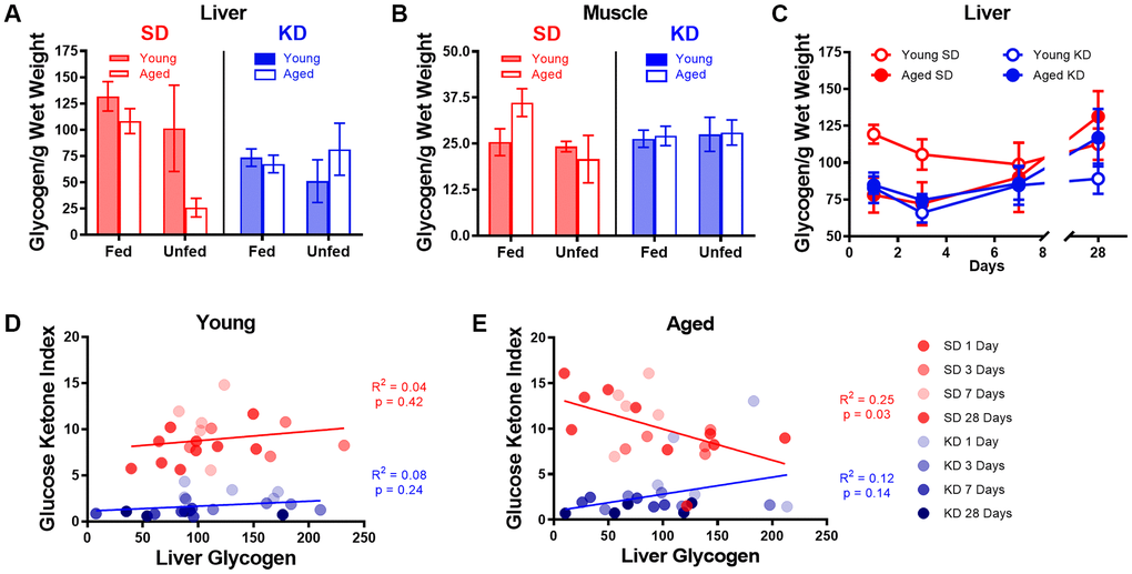 Surprisingly, in young rats, liver glycogen content did not correlate with the GKI during the initiation of TRF in either KD-fed rats (R2 = 0.08; p = 0.24) or SD-fed rats (R2 = 0.04; p = 0.42; Figure 8D). Furthermore, there was no correlation between liver glycogen and GKI in aged KD-fed rats during the initiation of ketosis (R2 = 0.12; p = 0.14; Figure 8E). However, in the SD-fed rats that switched from ad libitum feeding to TRF, liver glycogen in aged SD-fed rats significantly negatively correlated with GKI (R2 = 0.25; p = 0.03). These data demonstrate that it is not critical for liver glycogen to be depleted to initiate dietary ketosis in either aged or young animals. Moreover, in aged rats that are transitioning from ad libitum feeding to TRF of a SD, more glycogen is associated with lower GKI values. This suggests that the aged rats that adapt to being fasted by decreasing blood glucose and increasing BHB level spare liver glycogen content.
