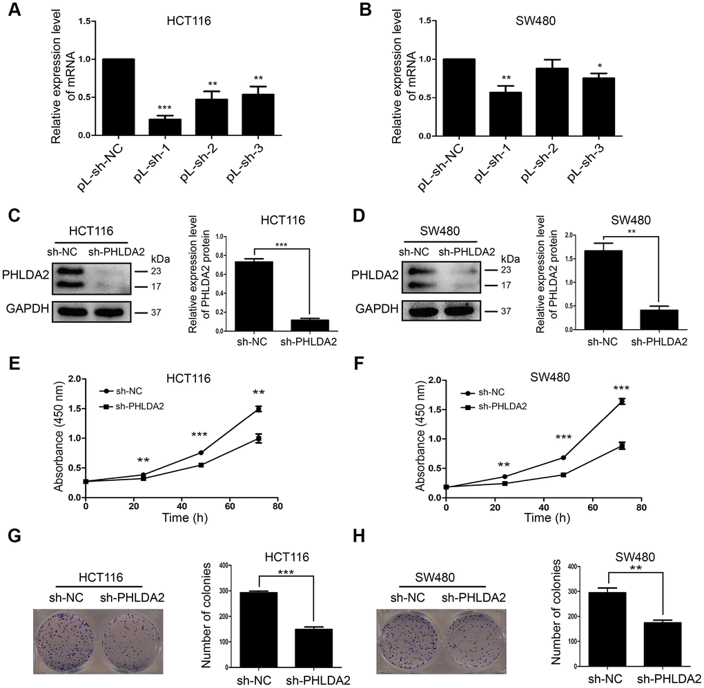 Since we selected HCT116 and SW480 for in vitro studies, we generated stably-transfected cells with low PHLDA2 expression. The highest knockout efficiency was exhibited by pL-sh-1 (Figure 2A, 2B). Lentivirus vector (sh-PHLDA2) strongly inhibited PHLDA2 protein levels in HCT116 (P < 0.001, Figure 2C) and SW480 (P < 0.01, Figure 2D) cells. To investigate the effect of PHLDA2 in CRC cells, we evaluated cell proliferation. The CCK8 assay demonstrated that low-expression of PHLDA2 inhibited HCT116 (P < 0.01, Figure 2E) and SW480 (P < 0.01, Figure 2F) cell growth. Colony formation assays revealed low-expression of that PHLDA2 suppresses the proliferation of HCT116 (P < 0.001, Figure 2G) and SW480 (P < 0.01, Figure 2H) cells. These results demonstrate that low-expression of PHLDA2 inhibits the proliferation of CRC cells.
