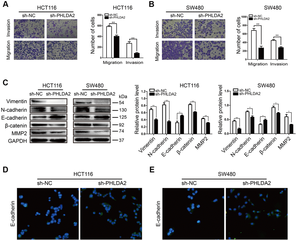 To assess the effect of PHLDA2 on migration and invasion of CRC cells, we performed Transwell and Matrigel assays. Invasion and migration by HCT116 (P < 0.01, Figure 3A) and SW480 (P < 0.01, Figure 3B) cells were reduced by sh-PHLDA2. Sh-PHLDA2 also reduced the levels of EMT-related proteins including; N-cadherin, Vimentin, β-catenin, and MMP2. In contrast, sh-PHLDA2 increased E-cadherin levels in CRC cells (Figure 3C–3E). Therefore, a reduction in PHLDA2 levels inhibits invasion and migration by CRC cells through effects on EMT.