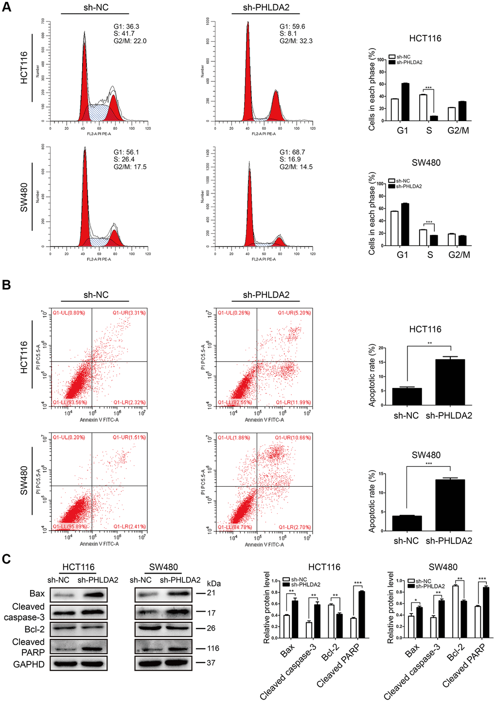 Analysis of cell cycle distribution and apoptosis of HCT116 and SW480 cells showed that knockdown of PHLDA2 inhibition stalled cells in G1/S phase (P < 0.001, Figure 4A) and increased apoptosis (Figure 4B). Western blot demonstrated an increase in the expression of apoptosis-related proteins, including Cleaved caspase-3, Cleaved PARP, and Bax. Furthermore, sh-PHLDA2 transfection decreased Bcl-2 levels in CRC cells (Figure 4C). These results suggest that inhibition of PHLDA2 induces cell cycle arrest and apoptosis of HCT116 and SW480 cells.
